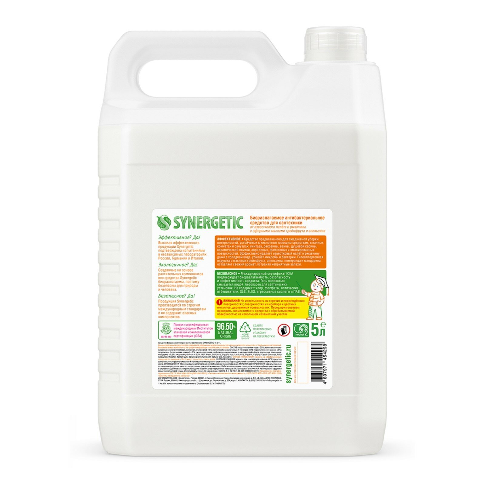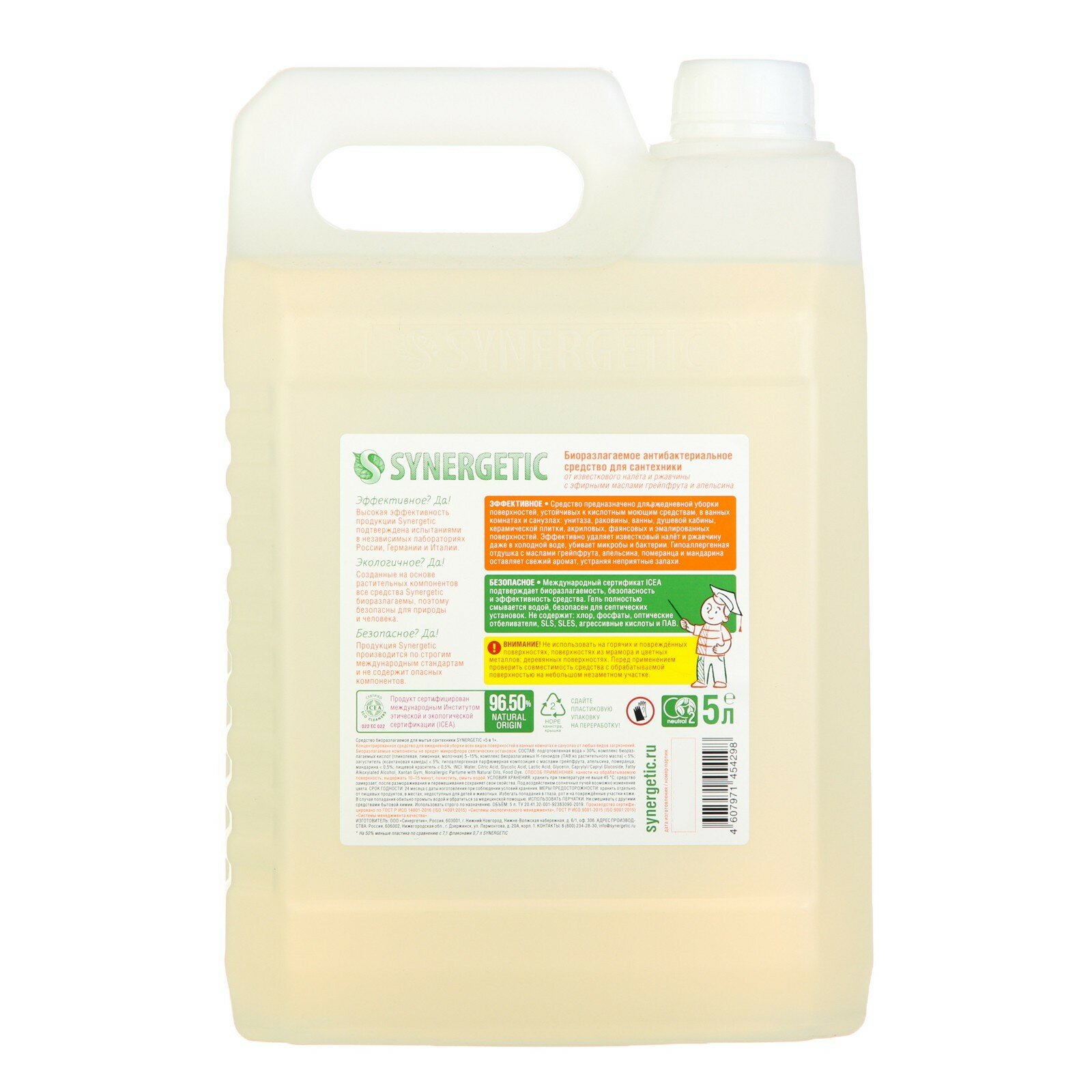 | Дополнительная информация | биоразлагаемое антибактериальное средство для сантехники SYNERGETIC "Грейпфрут и апельсин" - концентрированное чистящее средство для ежедневной уборки поверхностей, устойчивых к кислотным моющим средствам, в ванных комнатах и санузлах: унитаза, раковины, ванны, душевой кабины, керамической плитки, акриловых, фаянсовых и эмалированных поверхностей, средство с антибактериальным эффектом убивает микробы и бактерии, а также эффективно устраняет неприятные запахи, гипоаллергенная парфюмерная композиция с маслами грейпфрута, апельсина, померанца и мандарина оставляет свежий аромат, международный экологический сертификат ICEA подтверждает биоразлагаемость, безопасность и эффективность средства, средство полностью смывается водой, не содержит хлор, фосфаты, оптические отбеливатели, SLS, SLES, агрессивные кислоты и ПАВ, биоразлагаемые компоненты не вредят микрофлоре септических установок. |