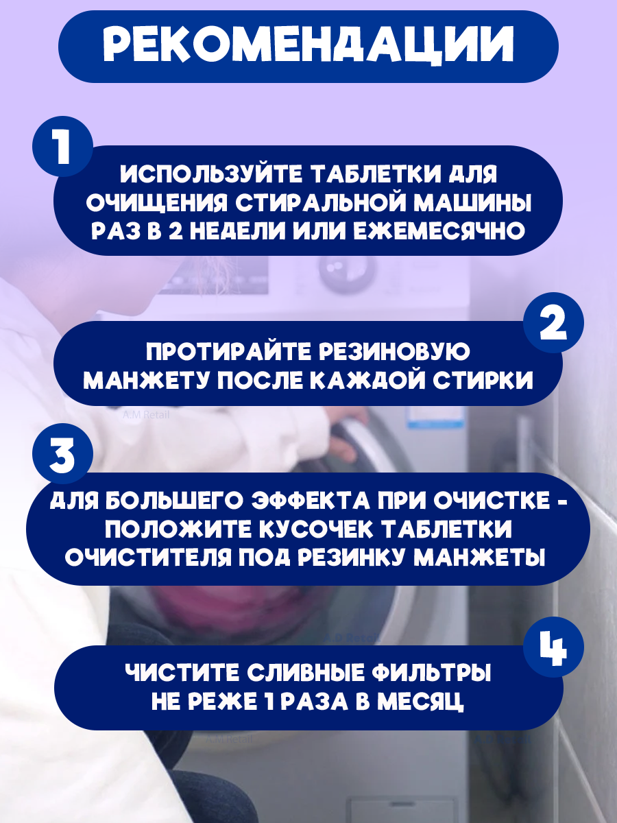| Подробная комплектация | Таблетки для чистки стиральной машины антибактериальные - 12 шт |