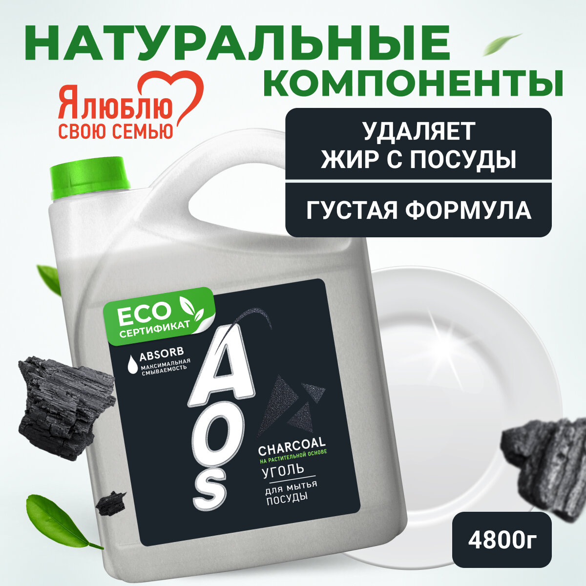 Средство для мытья посуды AOS уголь, ЭКО 450 г