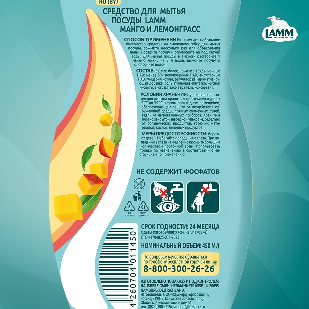 LAMM Нежные руки средство для мытья посуды Манго + Лемонграсс 450 мл, без фосфатов