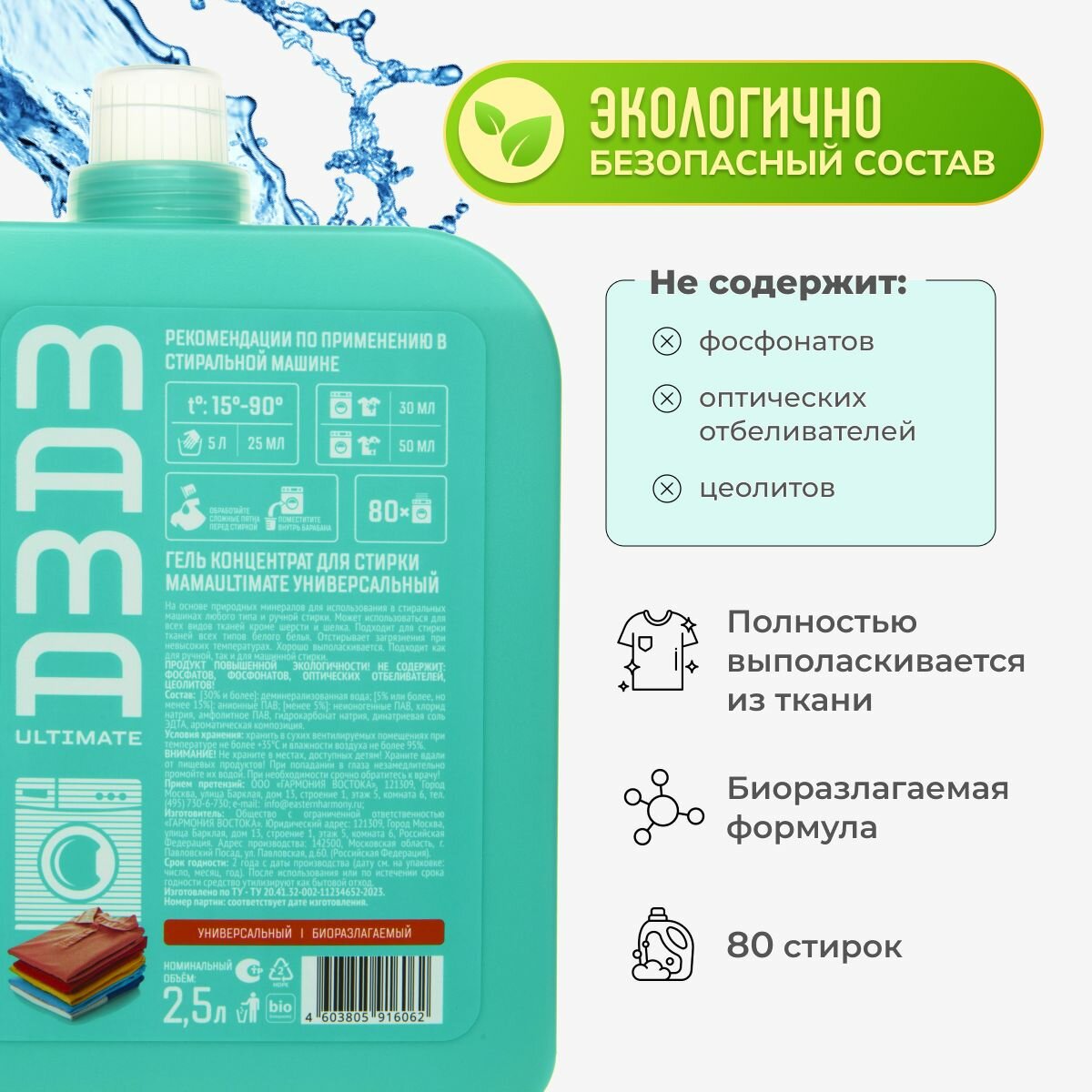 | Особенности | антибактериальное / безопасно для детей / безопасно для животных / биоразлагаемое / гипоаллергенное / для мытья в холодной воде / концентрат / можно использовать без перчаток / не тестировалось на животных / обезжиривание |