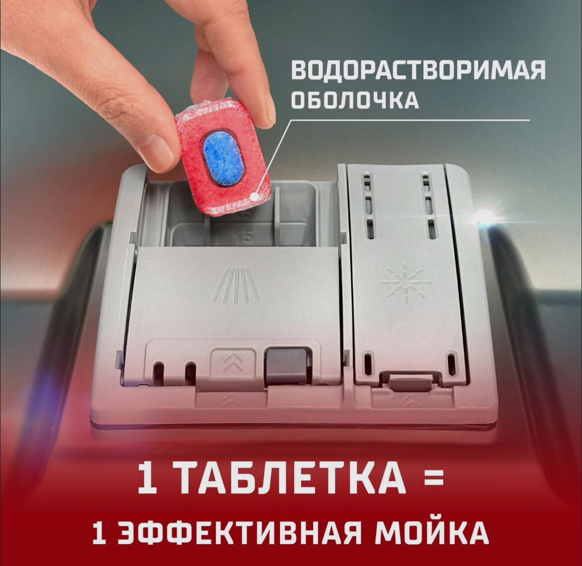 | Способ применения | Загрузите посуду в посудомоечную машину. Положите таблетку в отсек для моющего средства посудомоечной машины. Запустите моющий режим посудомоечной машины. Не водорастворимая оболочка таблетки, оболочку надо снимать |