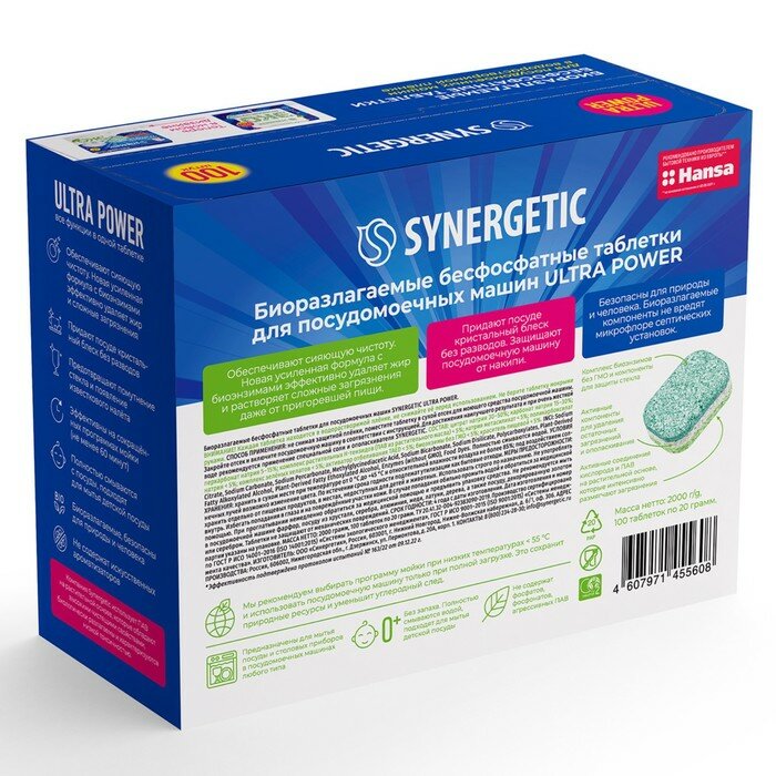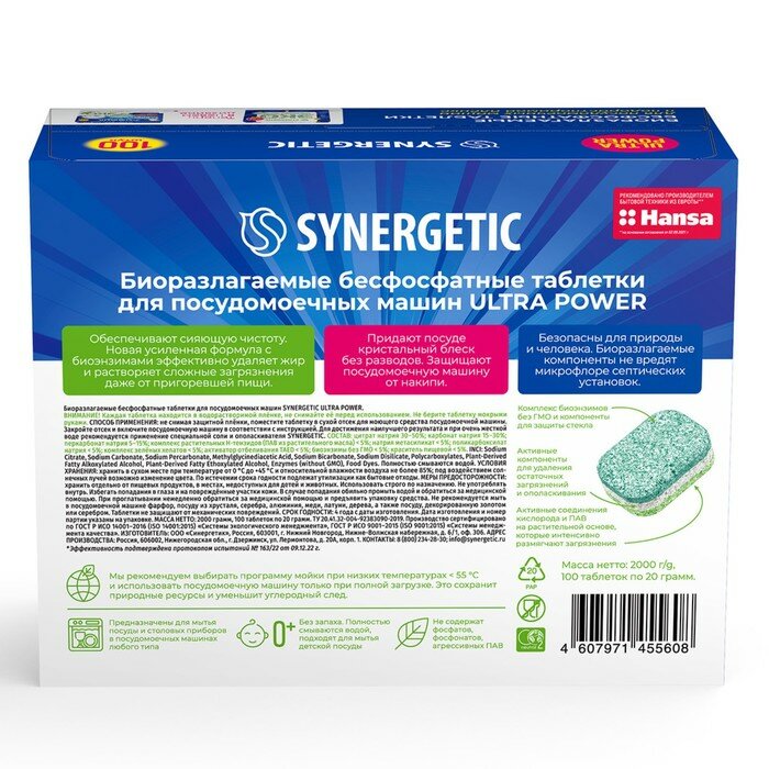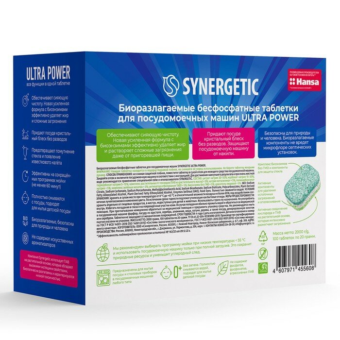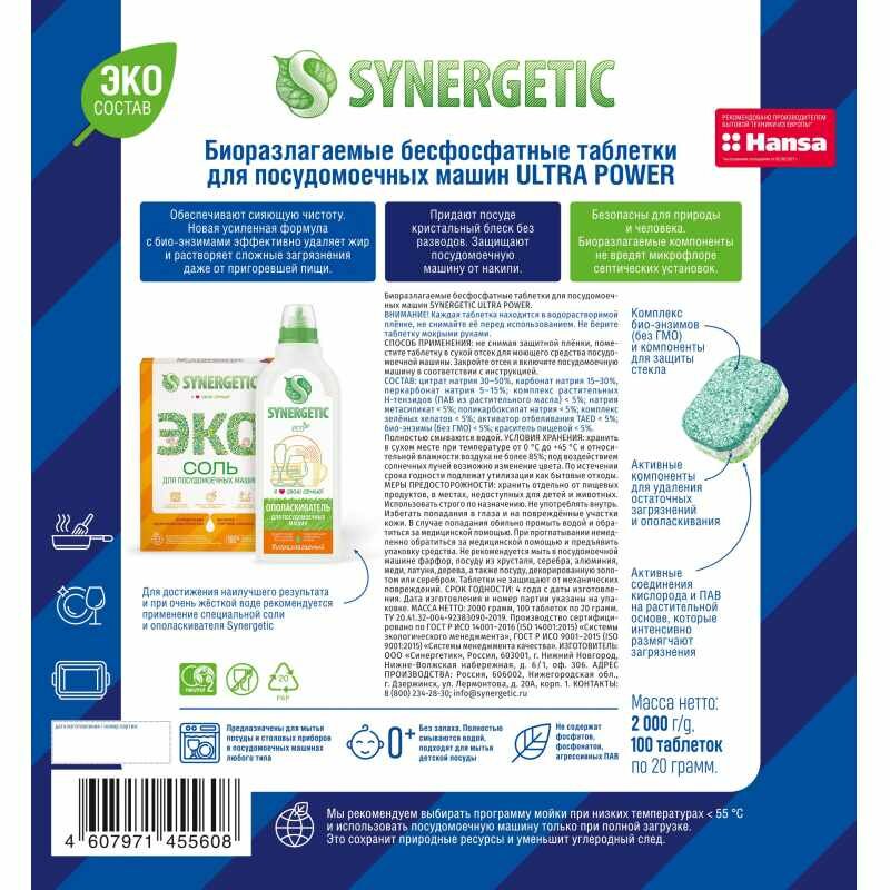 Таблетки для посудомойки Synergetic "Ultra Power", без запаха, 100 штук, 2,05 кг