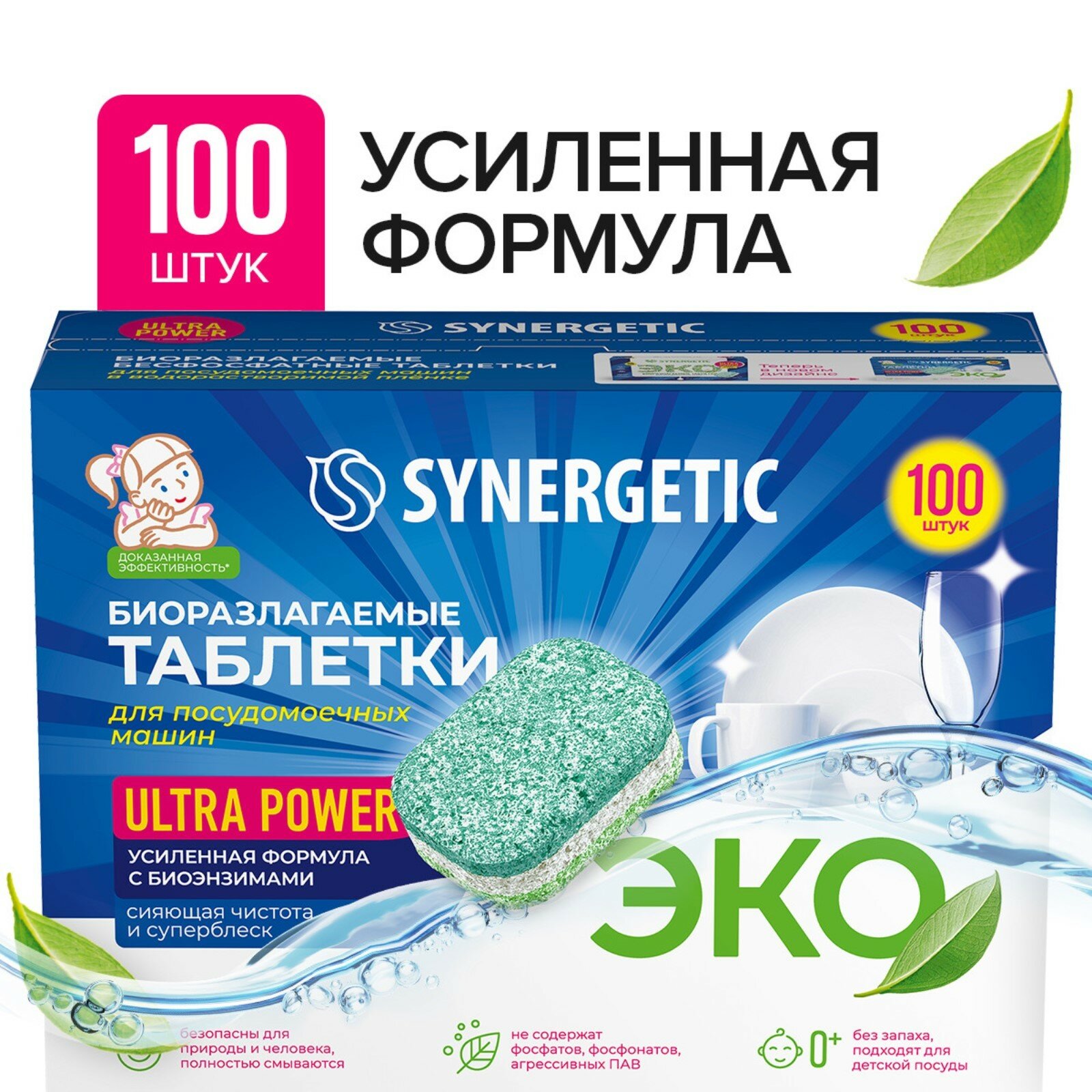 Таблетки для посудомоечных машин SYNERGETIC ULTRA POWER 100 шт, без запаха, бесфосфатные, биоразлагаемые, усиленная формула с био-энзимами