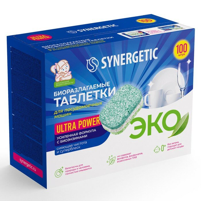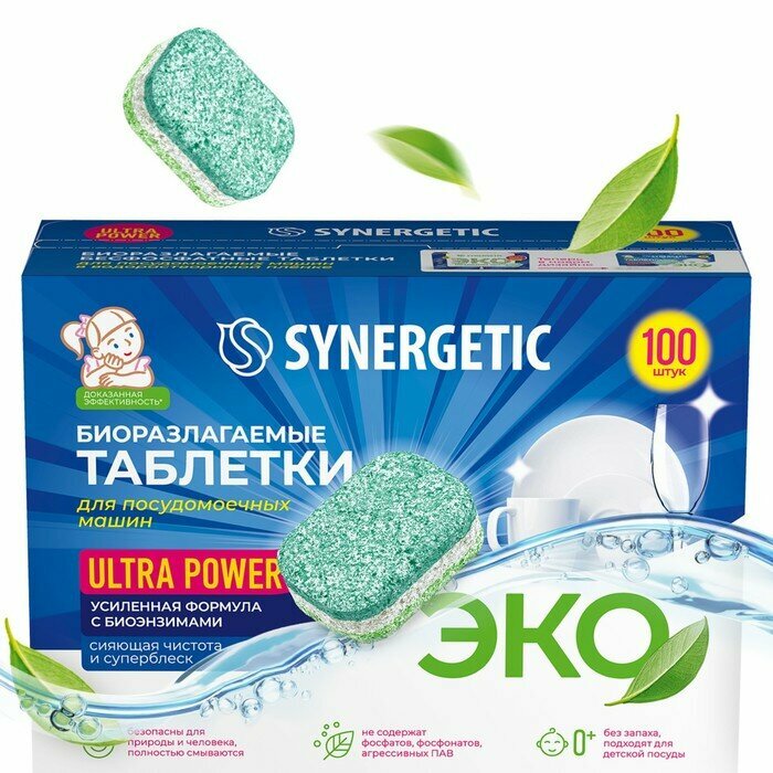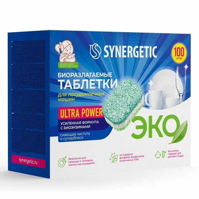 Купить Таблетки для посудомоечных машин Synergetic Ultra power, бесфосфатные,биоразлагаемые, 100 шт