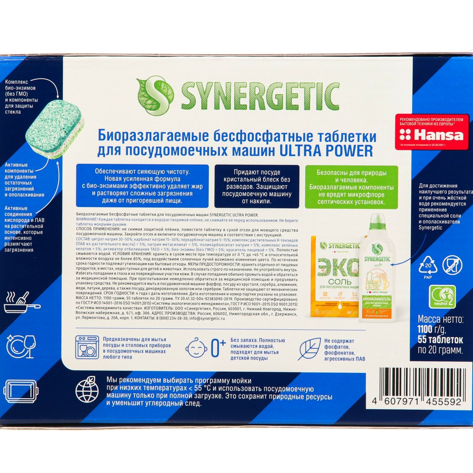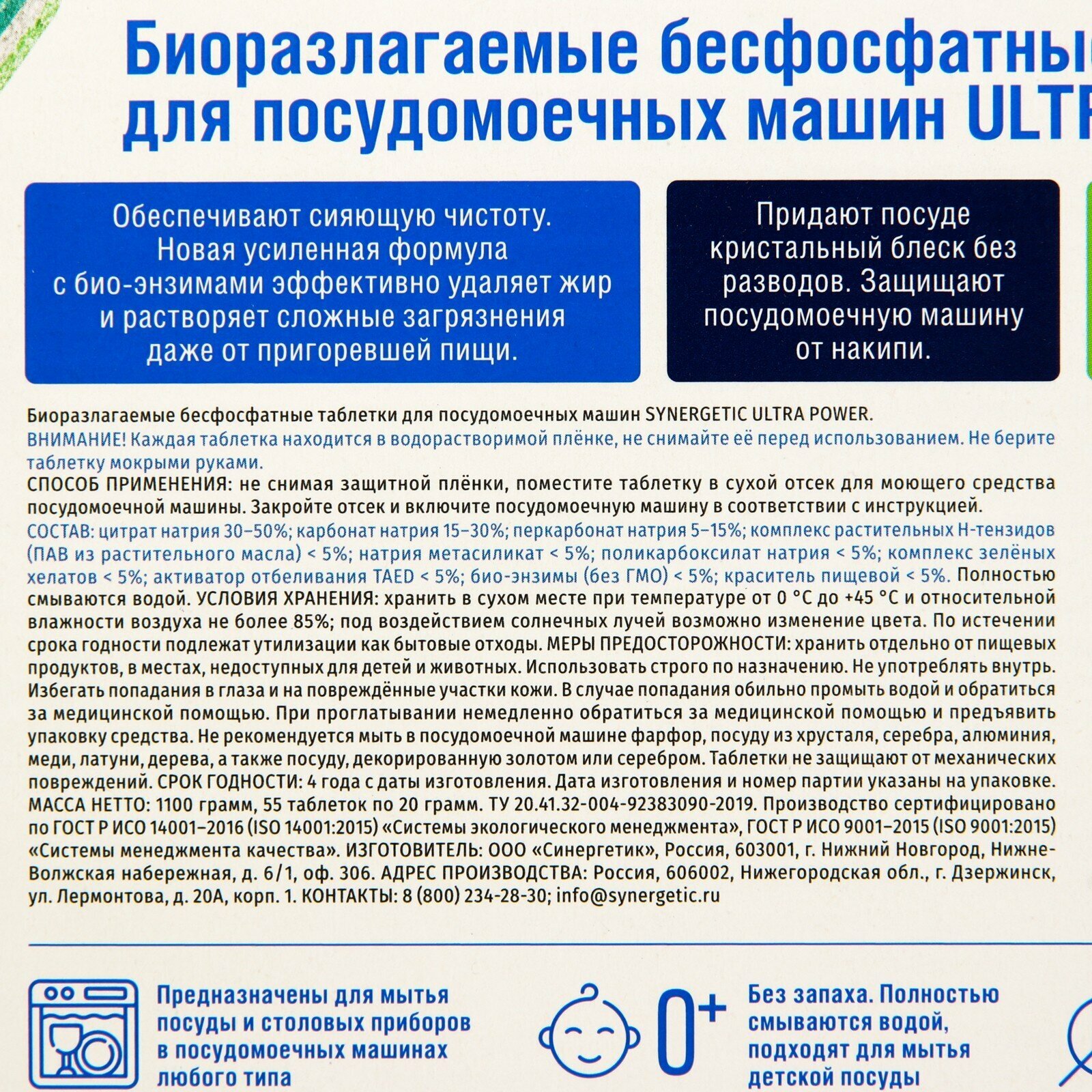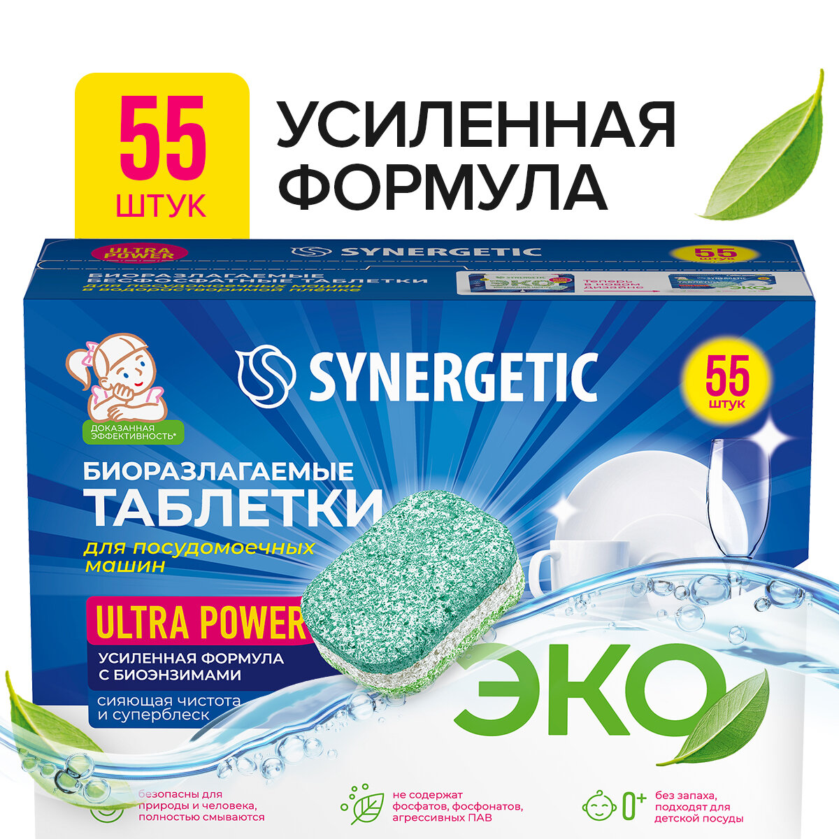Таблетки для посудомоечных машин SYNERGETIC ULTRA POWER 55 шт, без запаха, бесфосфатные, биоразлагаемые, усиленная формула с био-энзимами