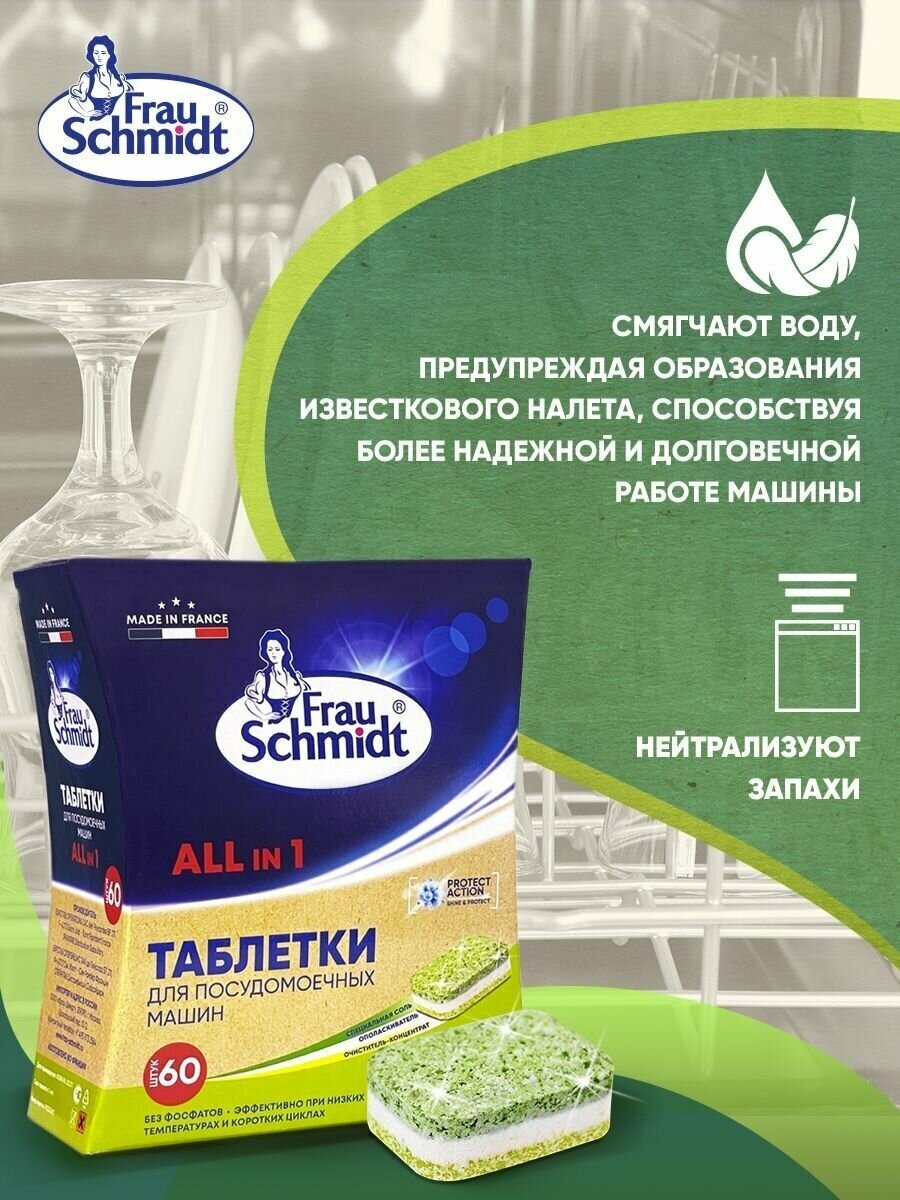 Купить Таблетки для посудомоечной машины Frau Schmidt Эко с функцией соли и ополаскивателя средство для мытья посуды "Все в 1" без фосфатов 60 таб