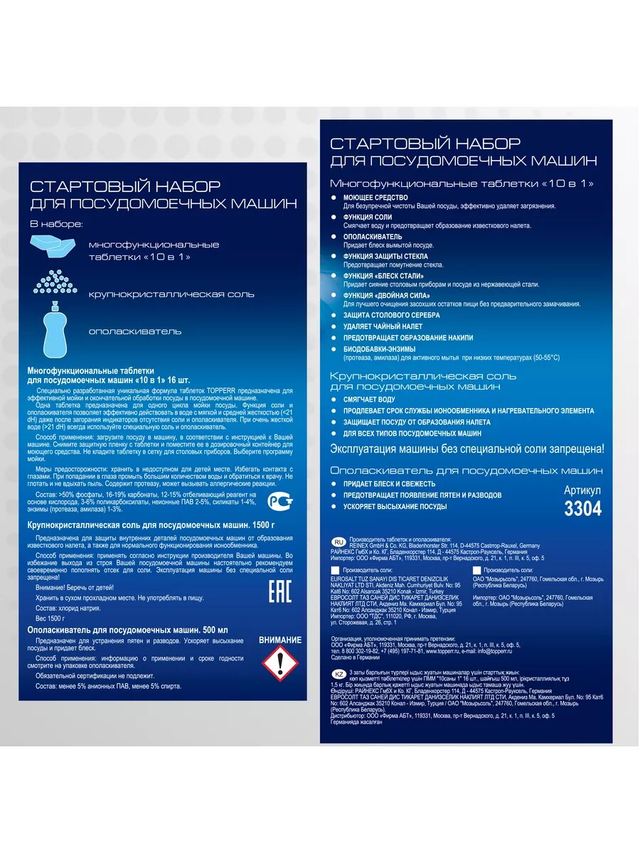 | Комплектация | таблетки для посудомоечных машин «10 в 1» 16 шт; ополаскиватель для посудомоечных машин 500 мл; соль для посудомоечной машины 1,5 кг |