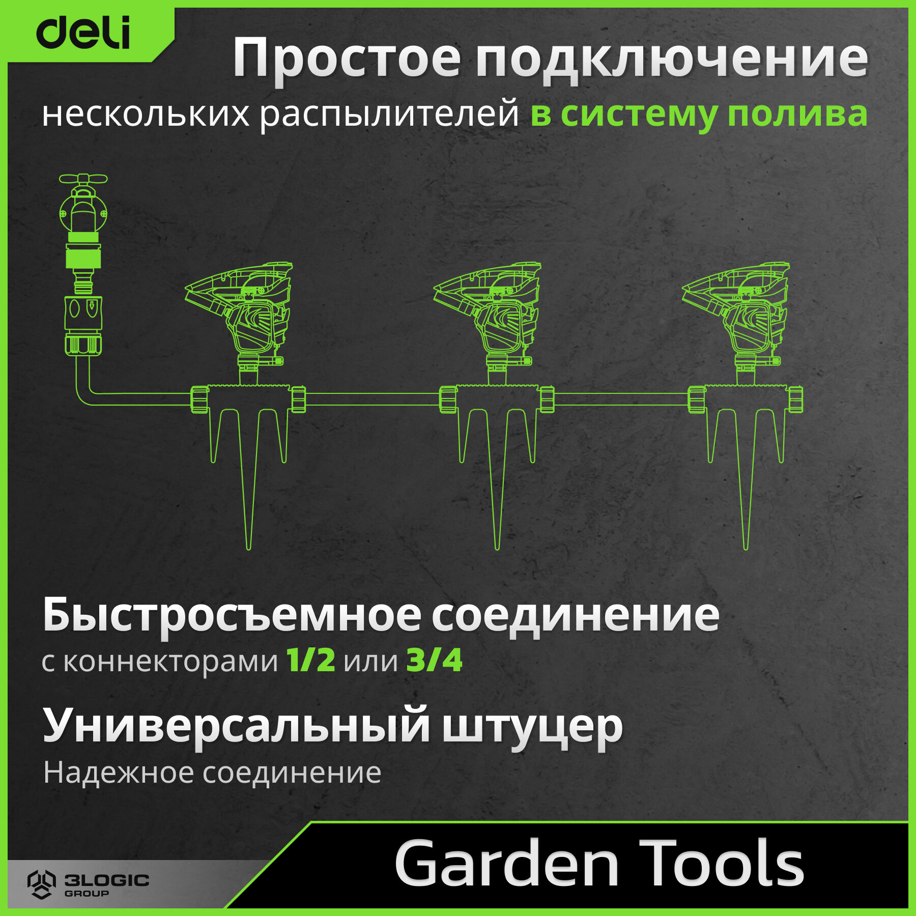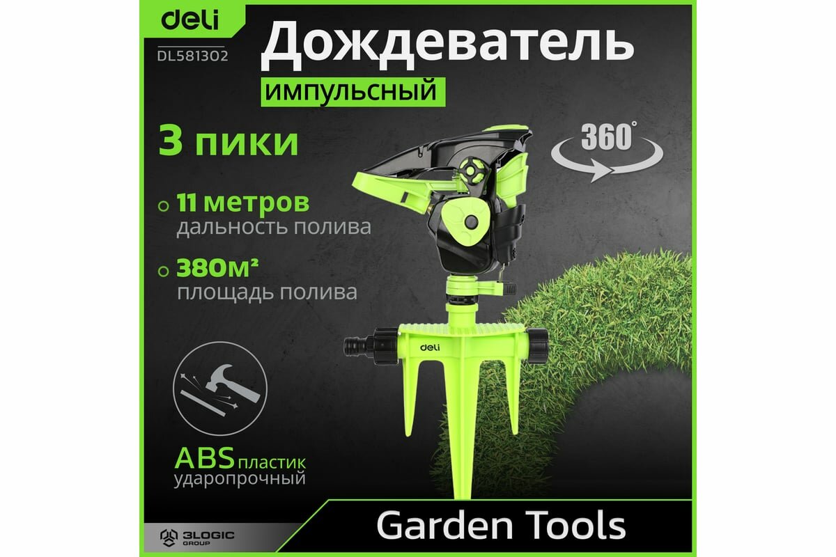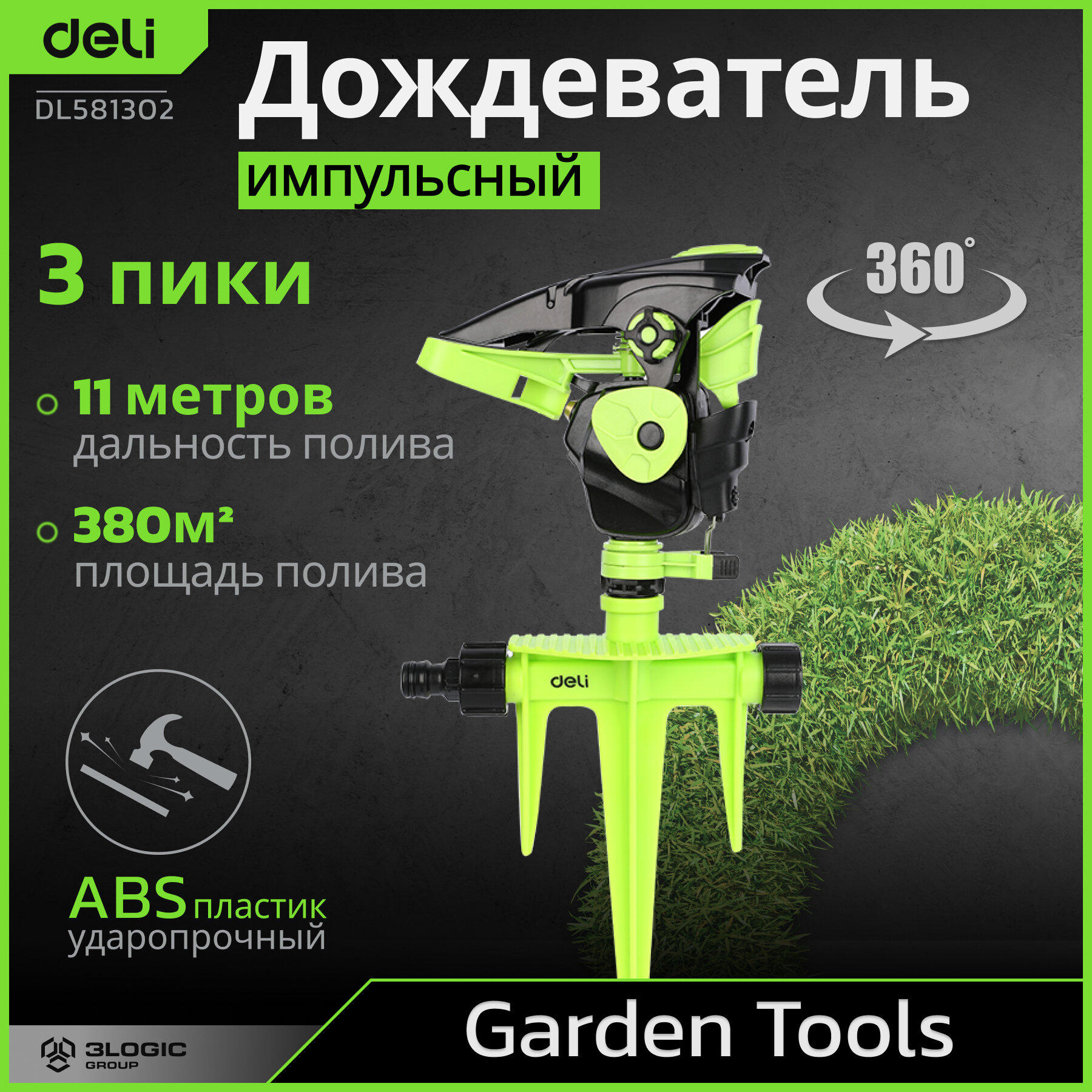 DELI Дождеватель-разбрызгиватель импульсный на 3-х пиках DL581302 площадь орошения до 380кв.м сектор полива 30-360 град ударопрочный пластик 133776 интересное: