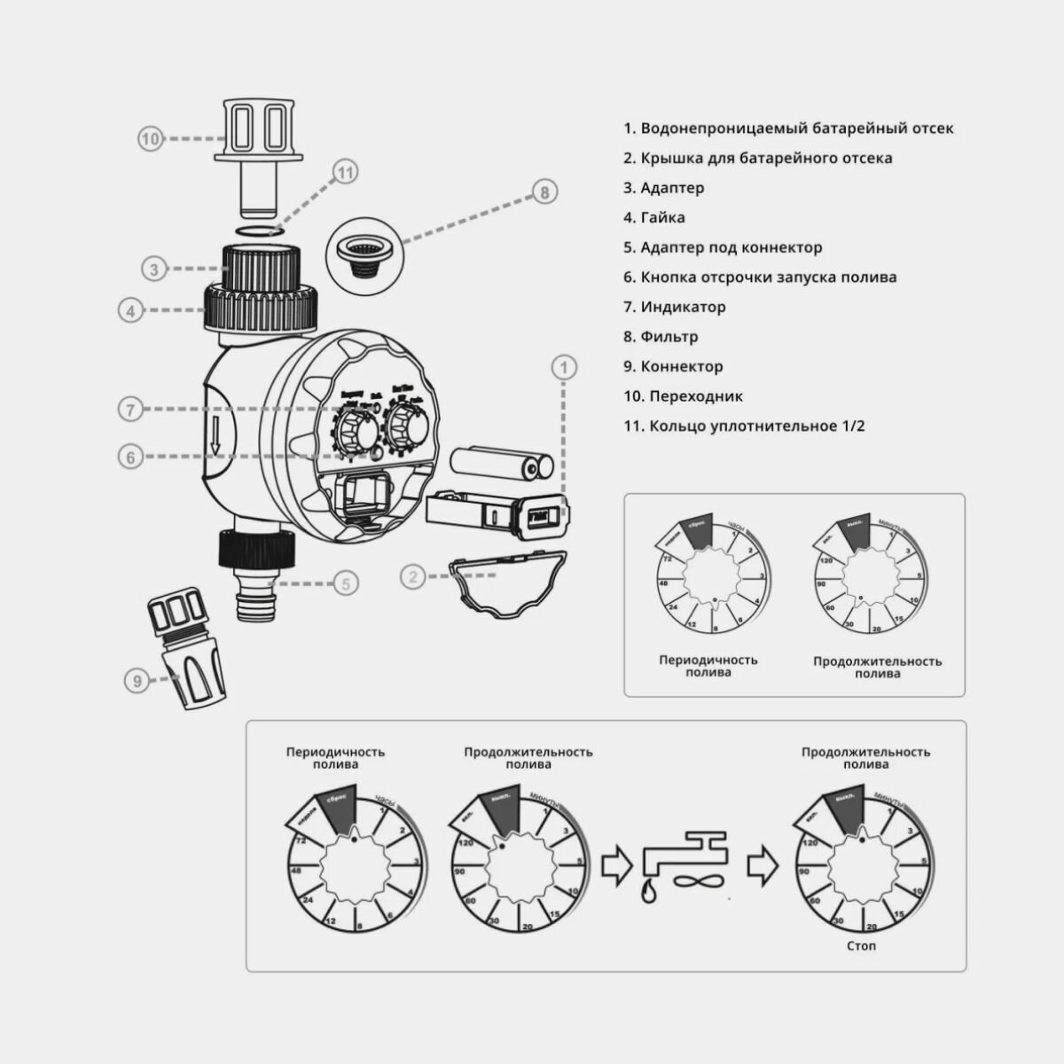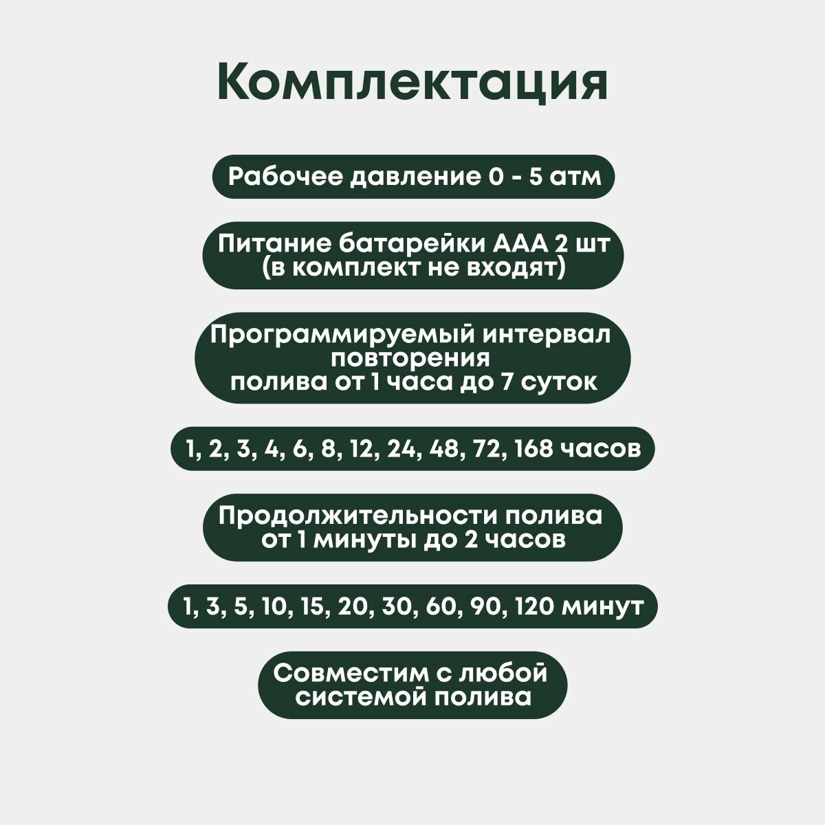 | Комплектация | Таймер "Жук" для полива с возможностью подключения датчика дождя |