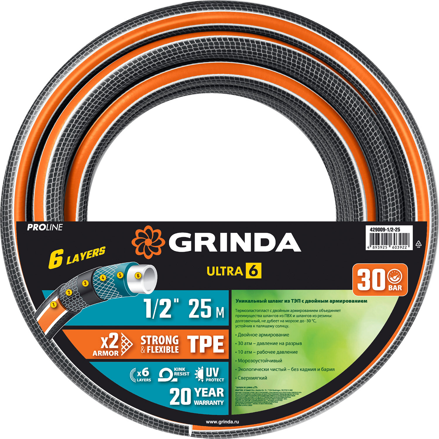 GRINDA ULTRA 6, 1/2″ 25 м 30 атм шестислойный, двойное армированиие, поливочный шланг PROLine (429009-1/2-25) интересное: