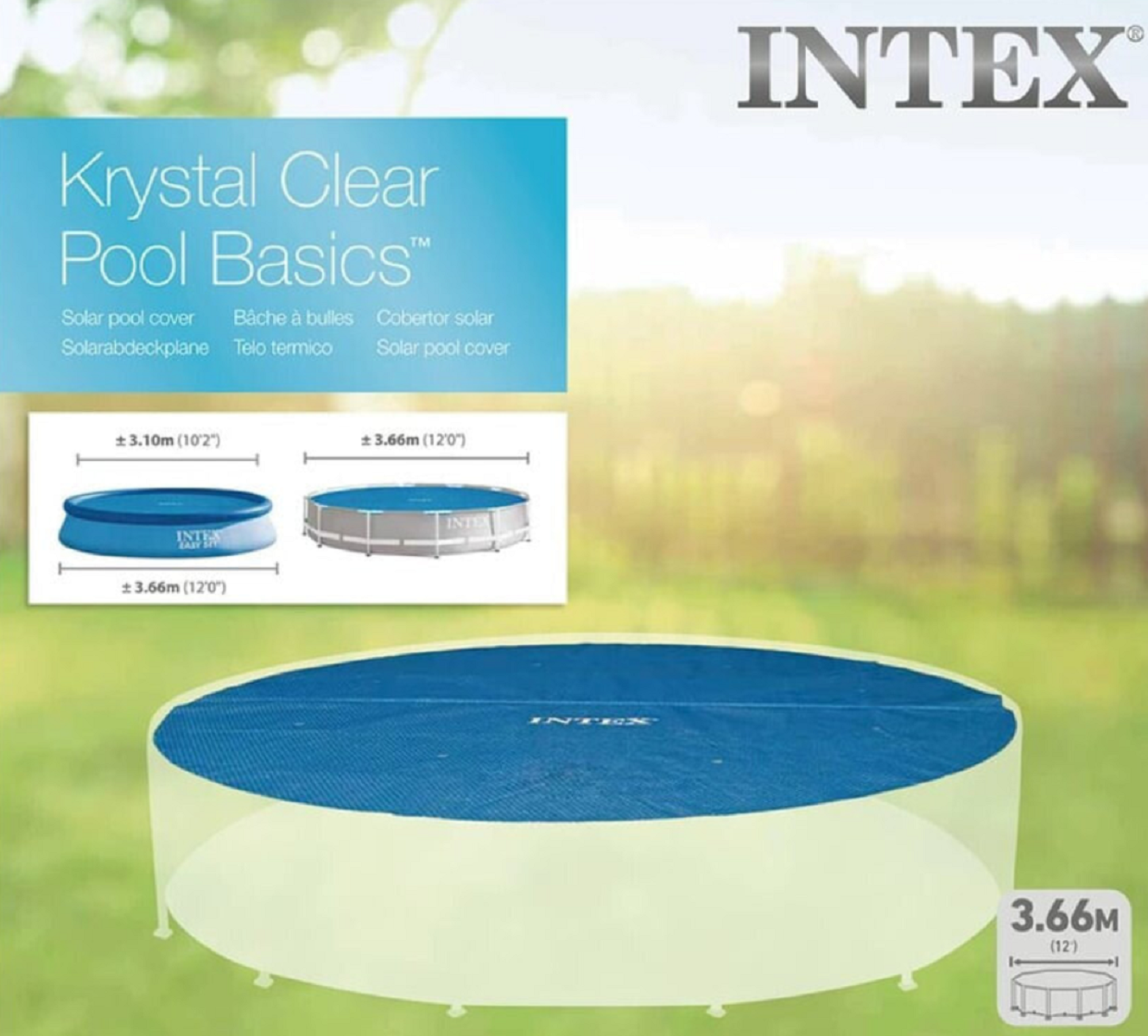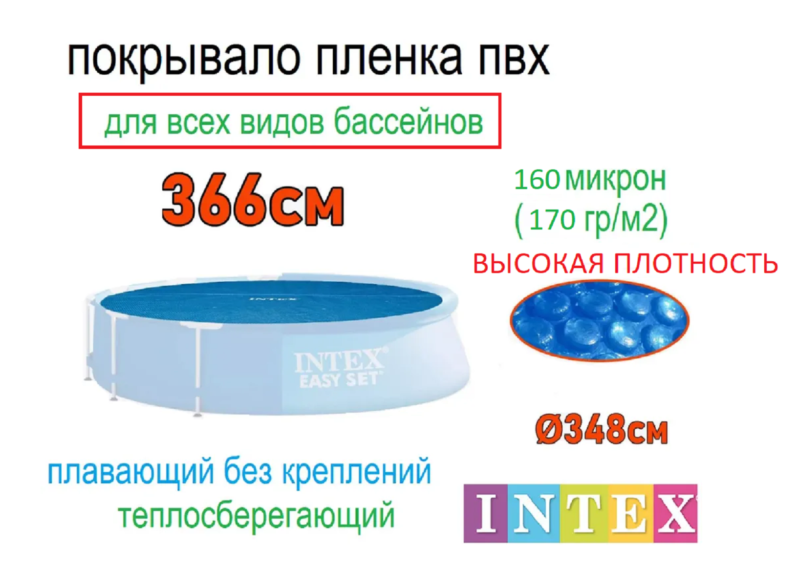 | Дополнительная информация | Тент для круглого бассейна 366 см - покрывало, пленка Intex Solar Cover 12' |