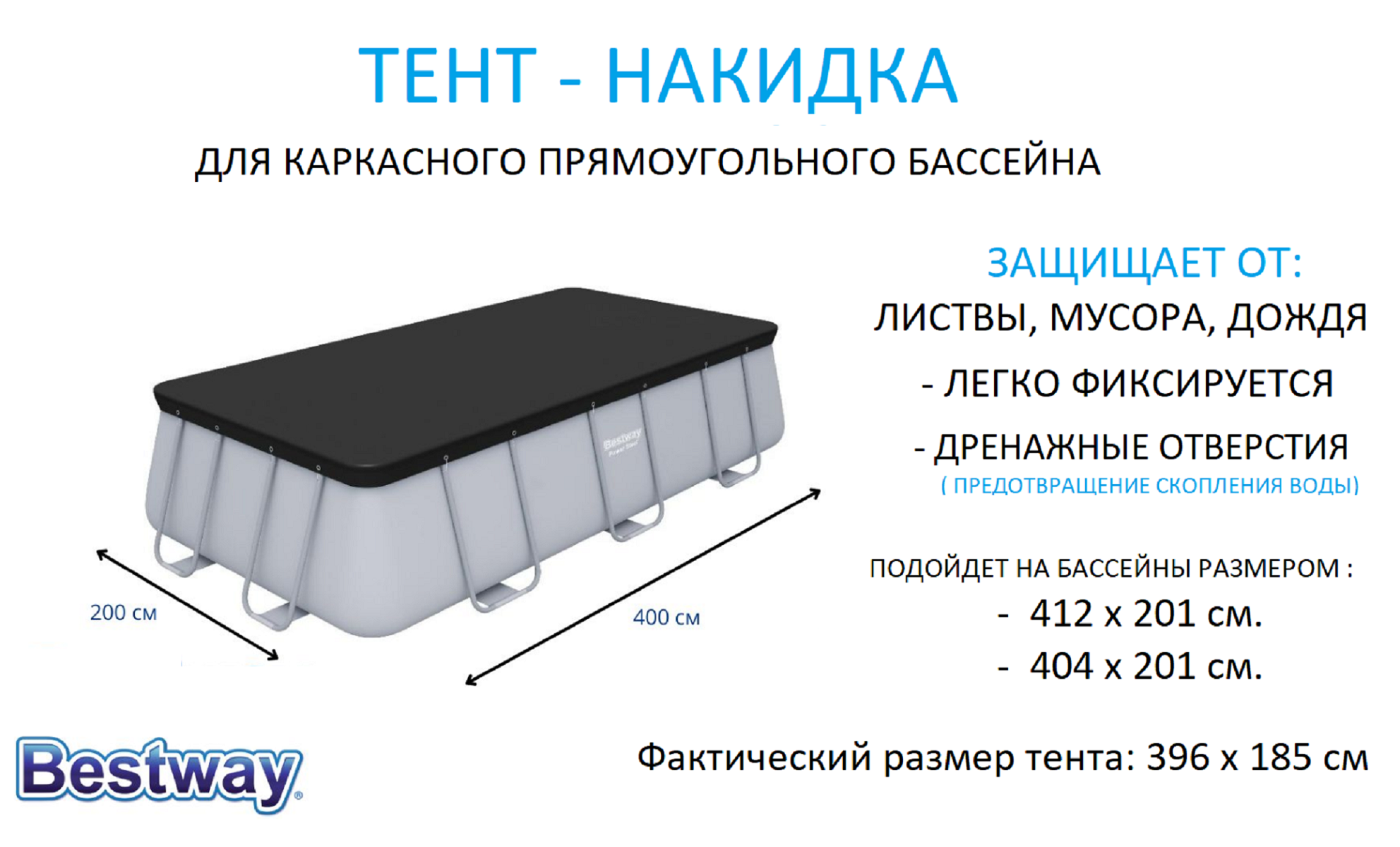 | Дополнительная информация | 58232 Тент для прямоугольного каркасного бассейна 412 х 201 см, покрывало 396 х 185 см, Bestway |