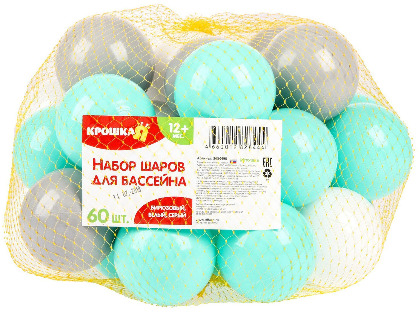 Шарики для сухого бассейна с рисунком, диаметр шара 7,5 см, набор 60 штук, цвет: бирюзовый, белый, серый интересное: