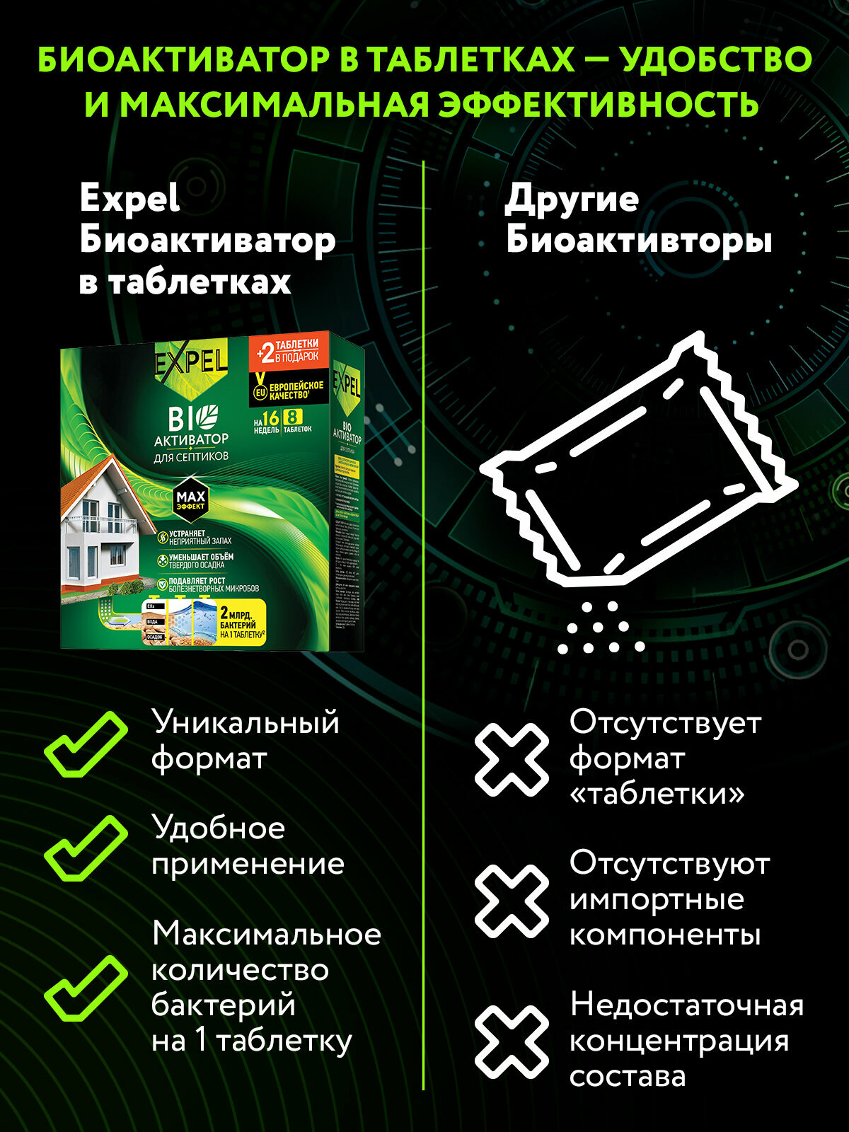 Биоактиватор для септиков и выгребных ям, Бактерии, средство для дачного туалета Expel, 10 таблеток