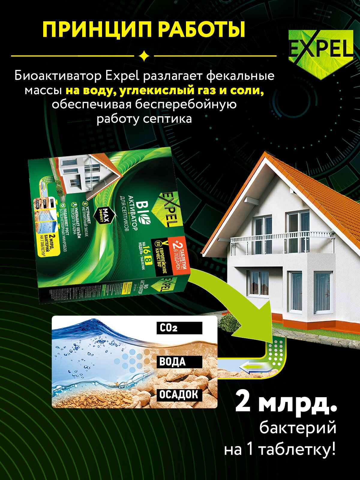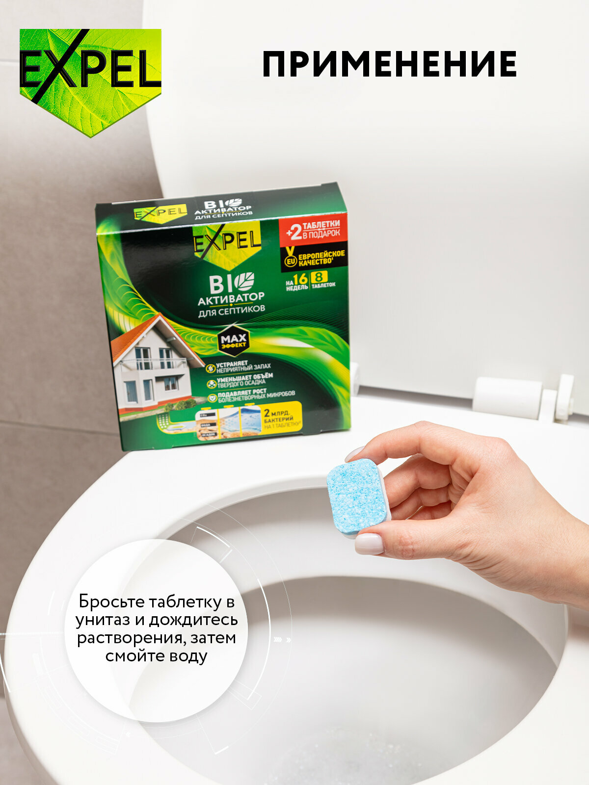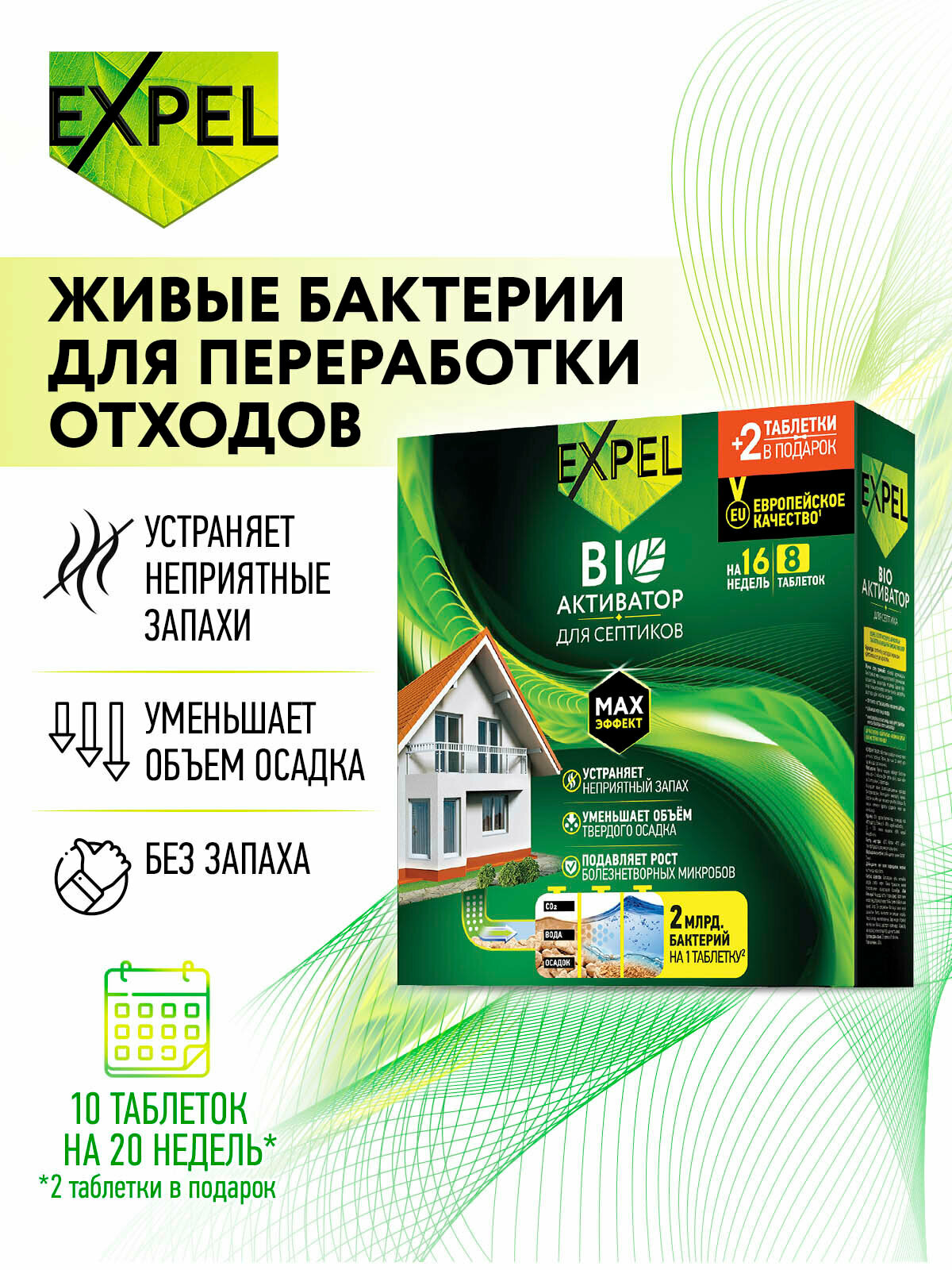 Бактерии для септиков и выгребных ям, биоактиватор, средство для дачного туалета Expel, 10 таблеток