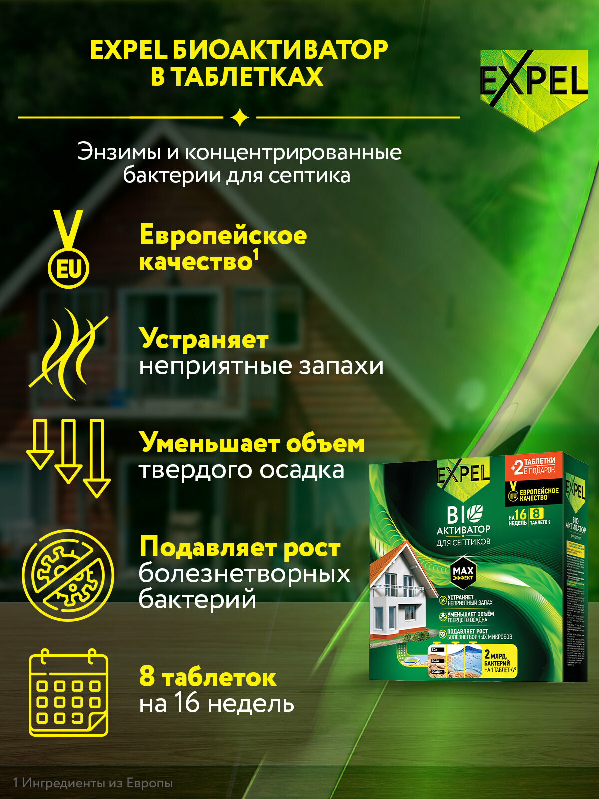 Ниже Вы можете прочитать отзывы на Expel Биоактиватор для септиков 8 таблеток, ознакомится с подробными характеристиками, посмотреть интересные обзоры и фотографии на Expel Биоактиватор для септиков 8 таблеток.
