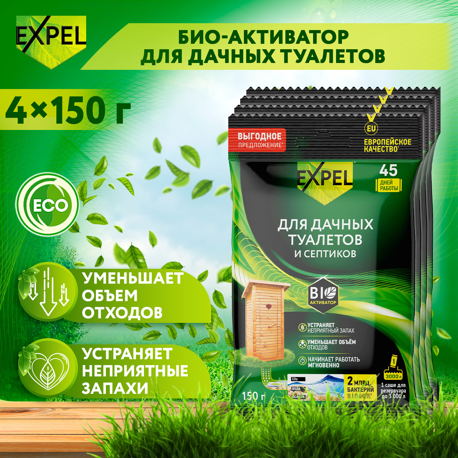 Биоактиватор для дачных туалетов и септиков, Expel, Бактерии, Средство для выгребных ям, 150 г х 4 шт интересное: