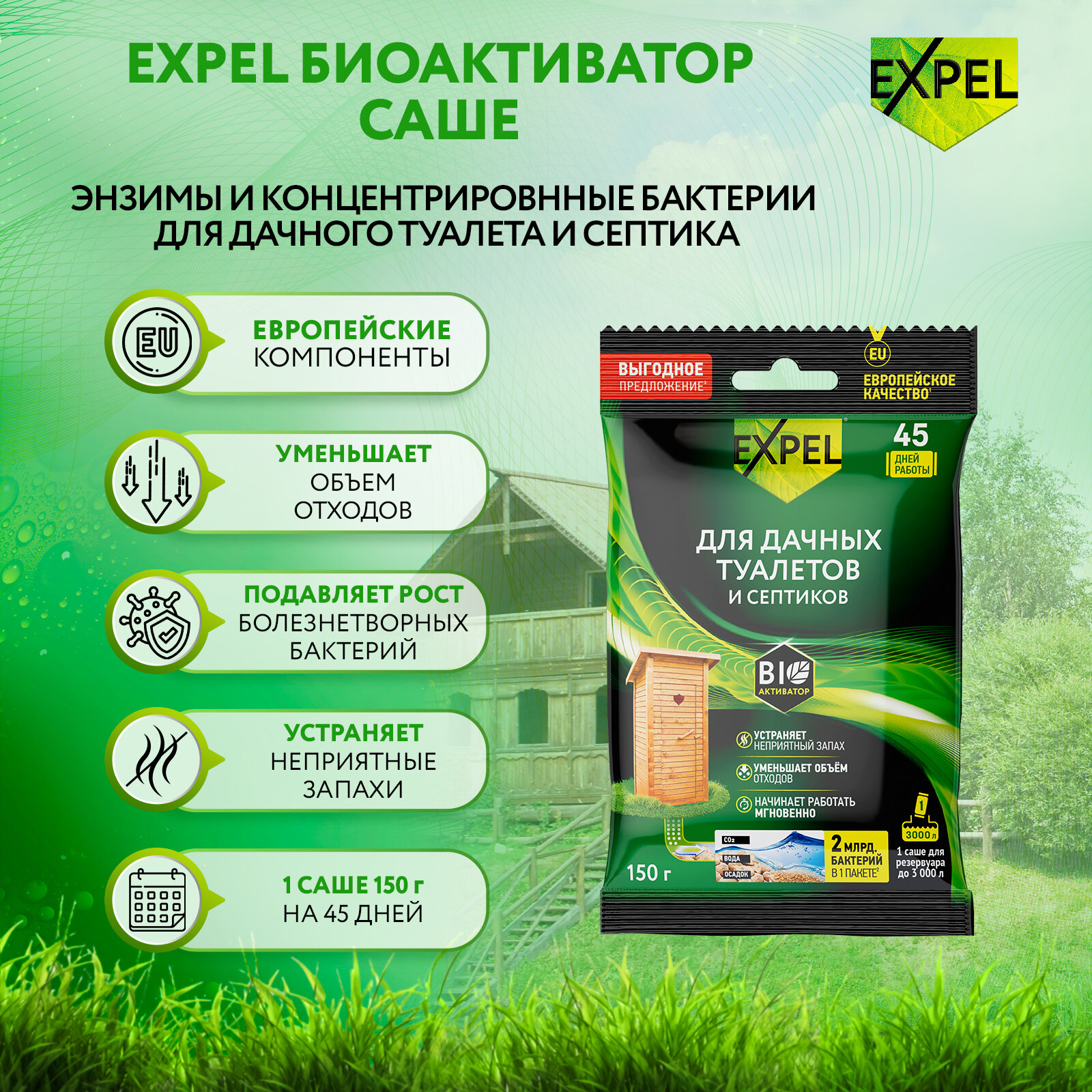 Купить Биоактиватор для дачных туалетов и септиков, Expel, Бактерии, Средство для выгребных ям, 150 г х 4 шт