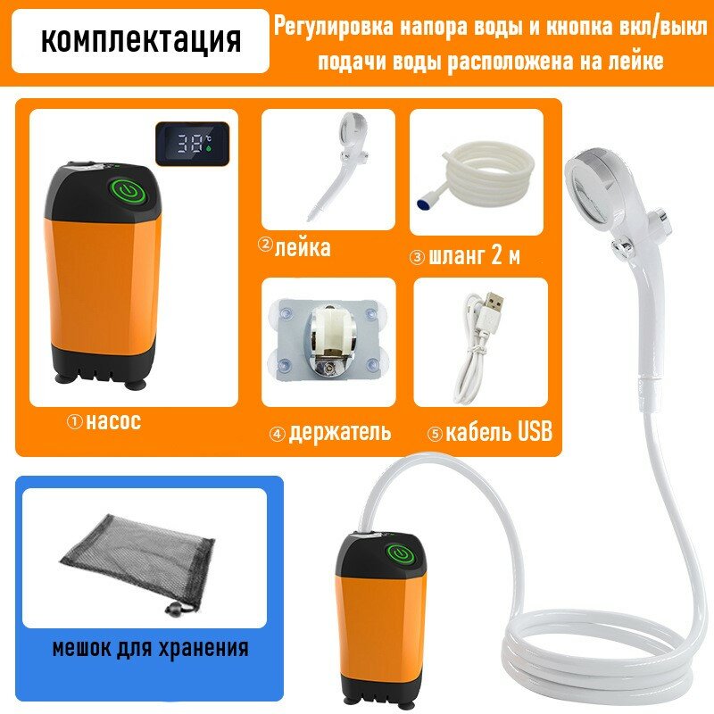 Душ походный с насосом, встроенным термометром, аккумулятором на 7800 мАч и цифровым дисплеем