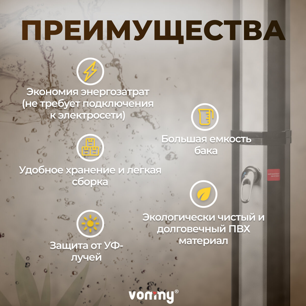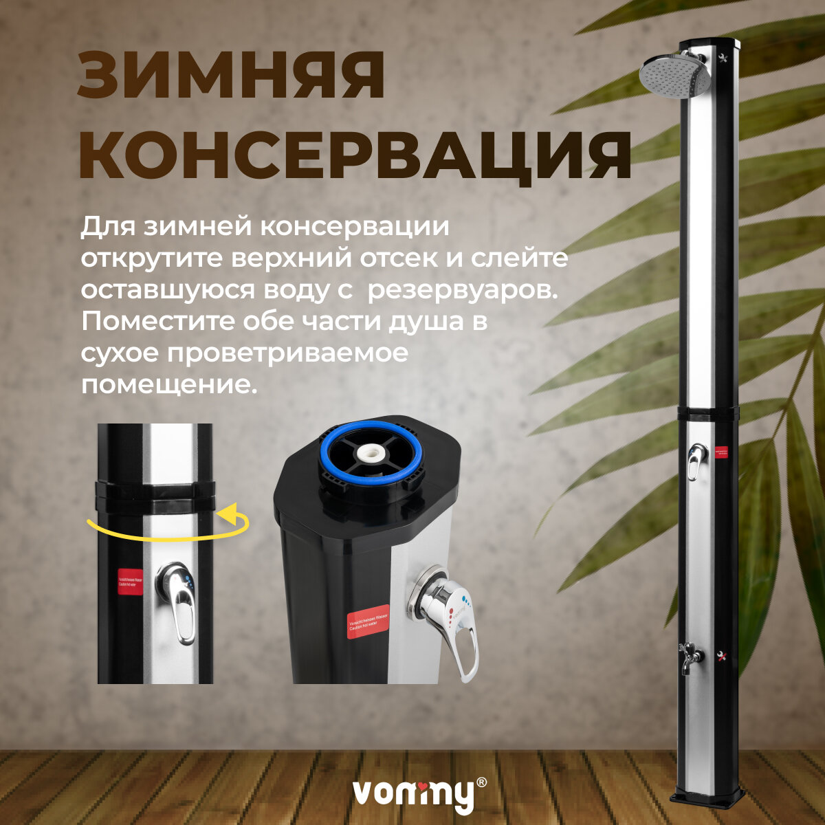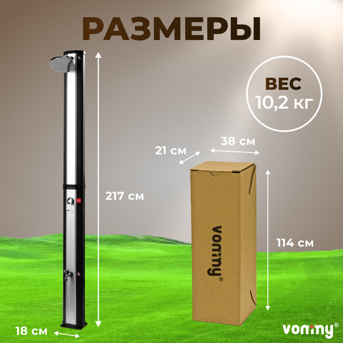 Солнечный уличный летний душ с подогревом от солнца Vommy. Объем 35 л, с краном для ног и большой лейкой для дачи интересное: