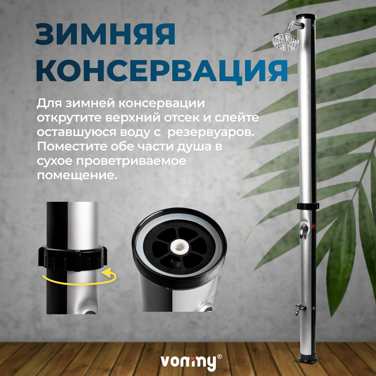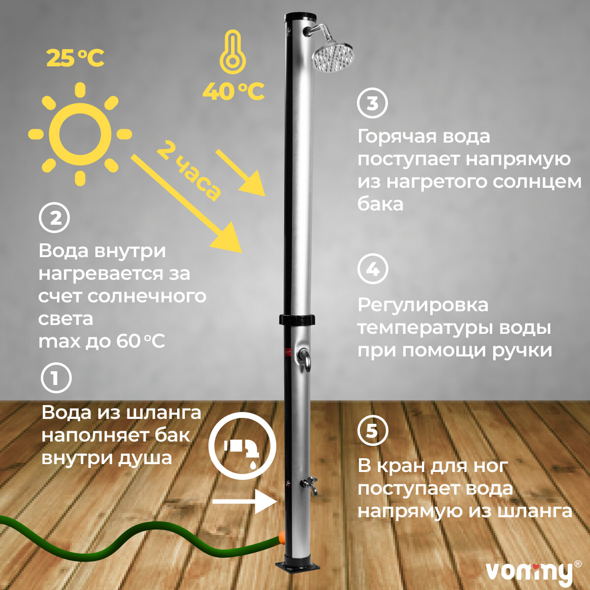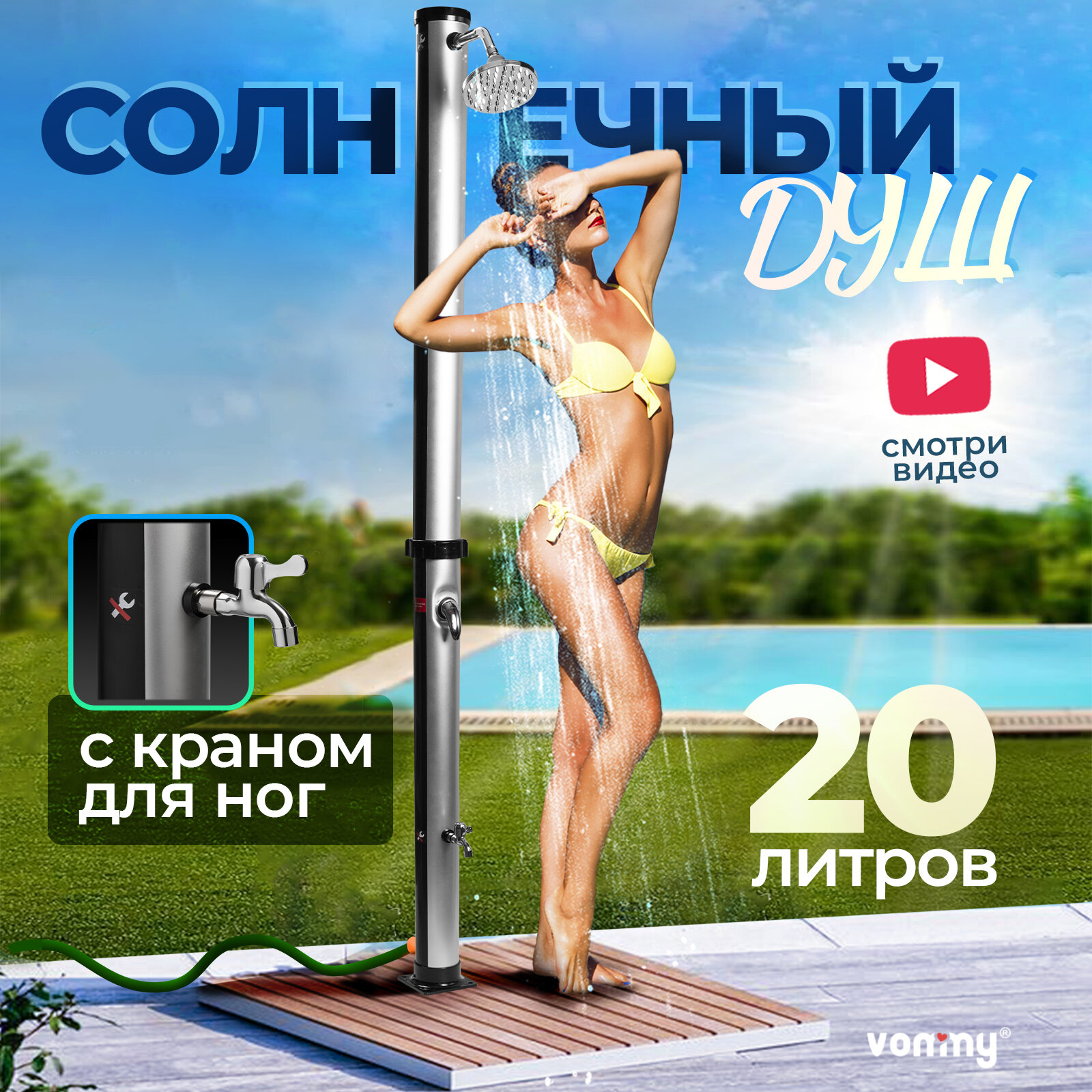 Солнечный уличный летний душ с подогревом от солнца Vommy. Объем 20 л, с краном для ног и большой лейкой для дачи интересное: