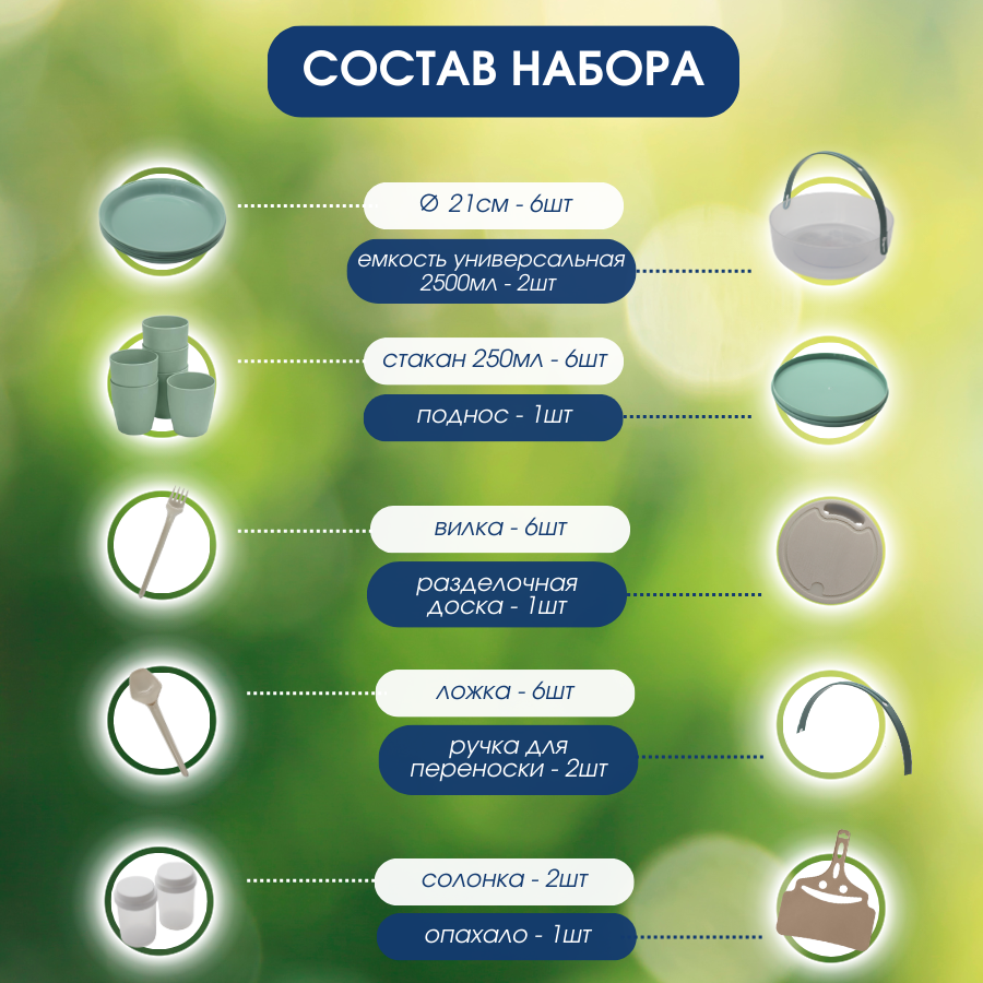 | Комплектация | Набор состоит из 31 предмета, включая 6 стаканчиков объемом 250 мл, 6 тарелок, 6 ложек, 6 вилок, 2 ёмкости для соли и специй, круглая разделочную доску, опахало, круглый поднос и кейс-переноску. |