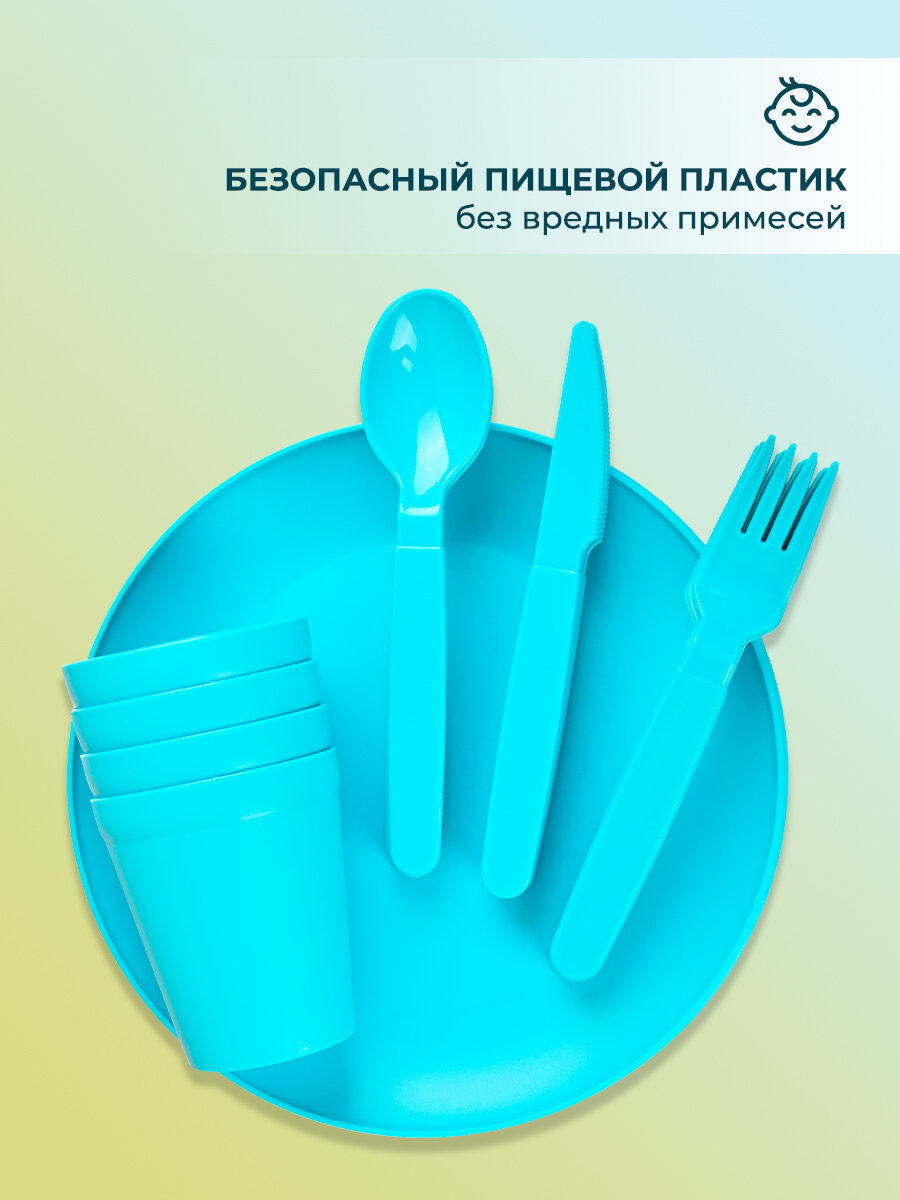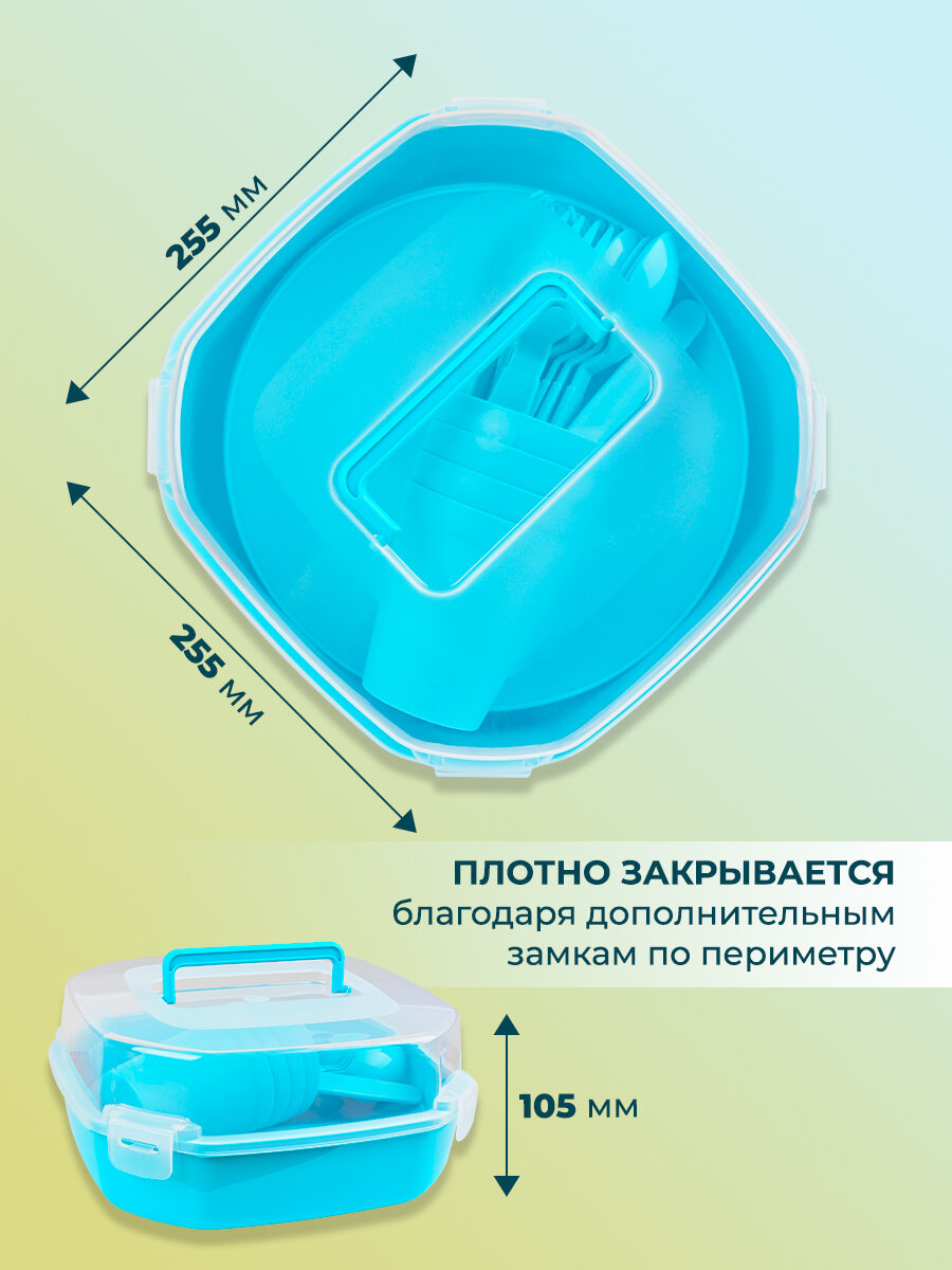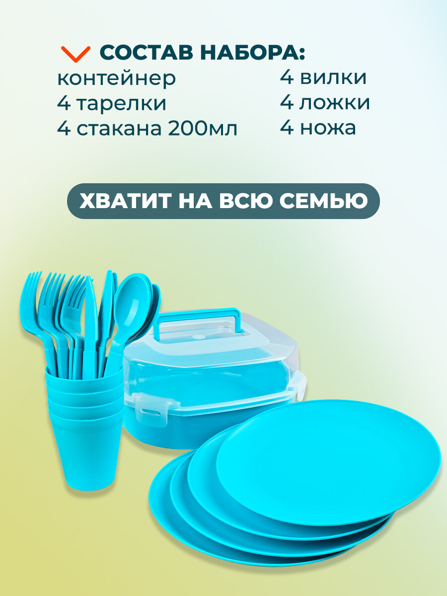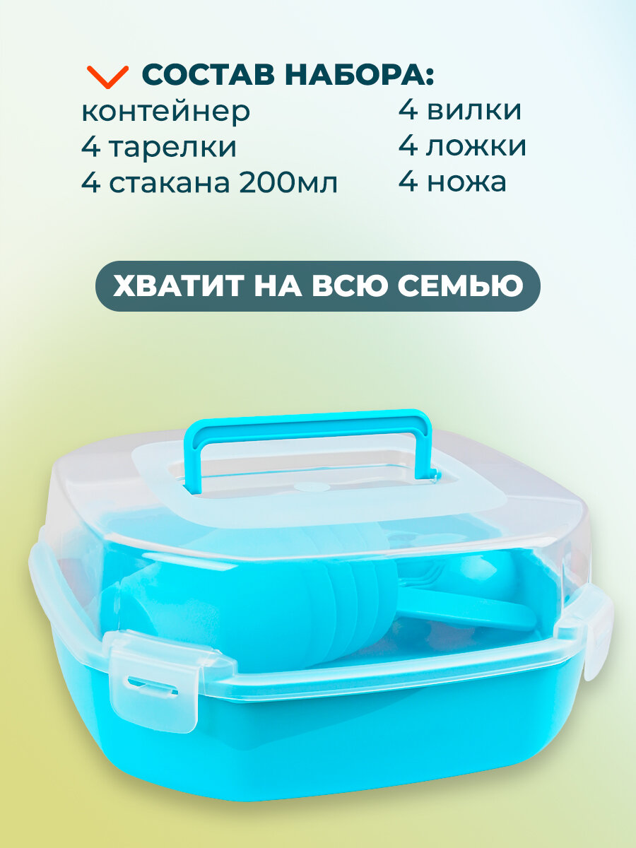 | Комплектация | Контейнер - 1 шт, Тарелки - 4 шт, Стакан - 4 шт, Вилка - 4 шт, Нож - 4 шт, Ложка - 4 шт |