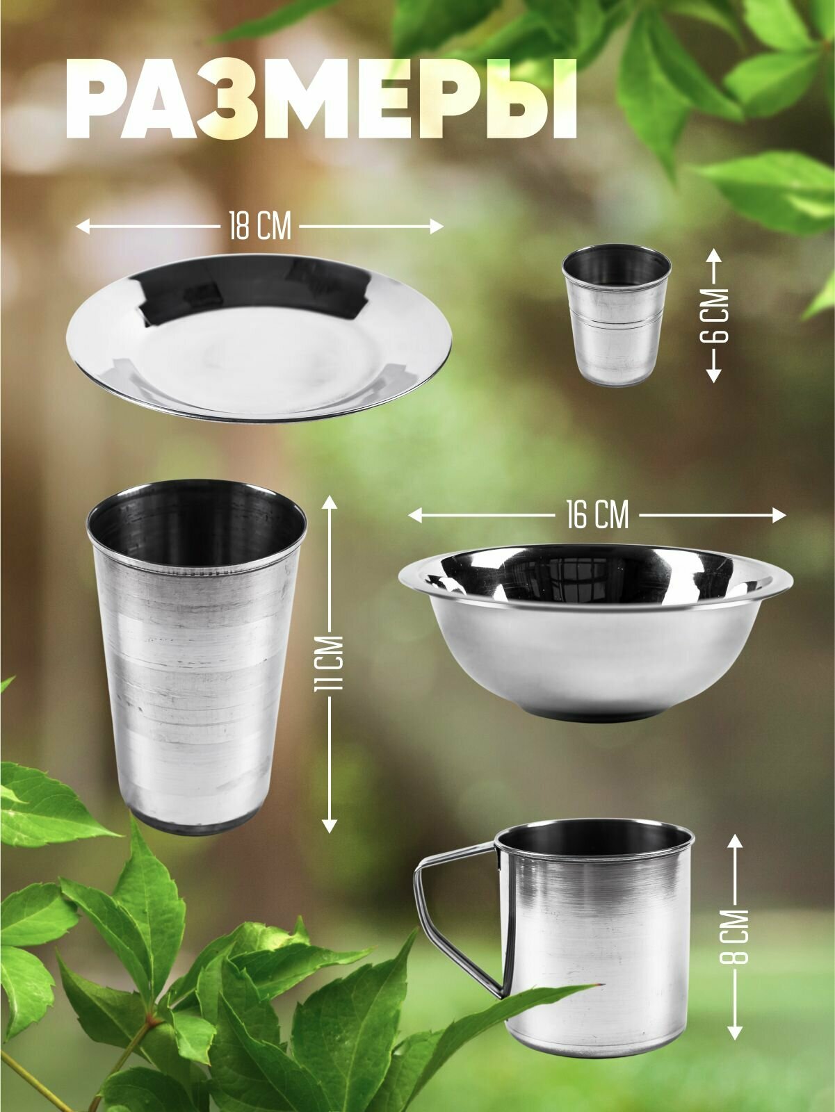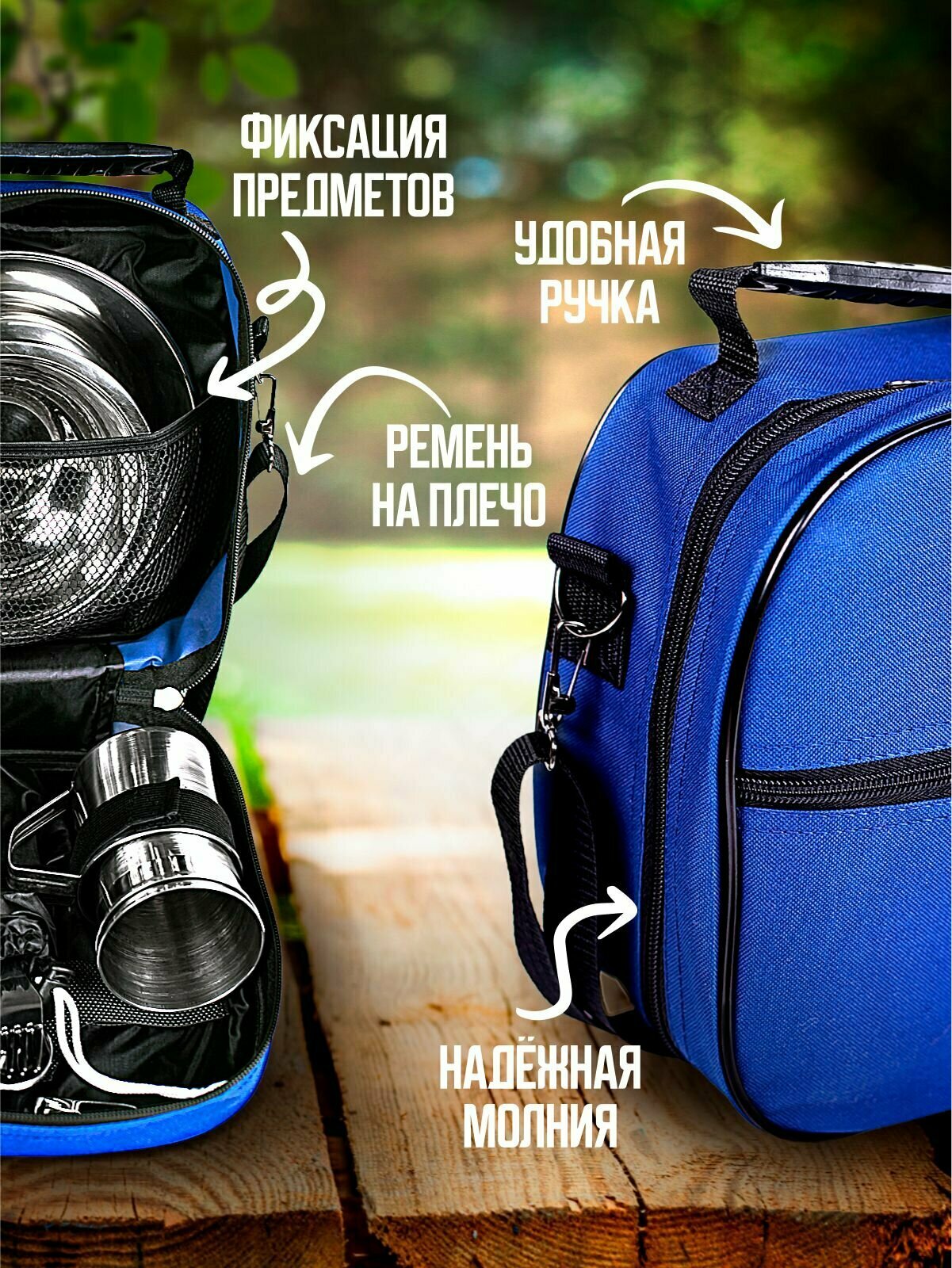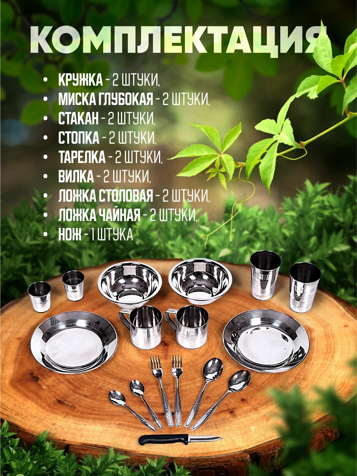 | Комплектация | Сумка ( рюкзак) 1 шт., кружка 2шт., миска глубокая 2шт., Стаканы 2 шт., стопка 2шт., тарелка 2шт., вилка 2шт., ложка столовая 2шт., ложка чайная 2шт., нож 1шт. |