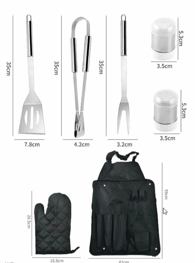 | Комплектация | щипцы, вилка, лопатка, баночки для специй - 2 шт., пихватка, сумка фартук |