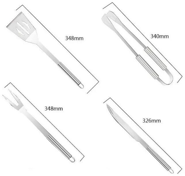 | Длина | вилка для мяса 34.80 см, лопатка 34.80 см, нож для мяса 32.60 см, щипцы 34 см |