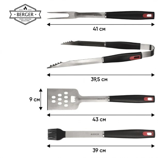 | Длина | вилка для мяса 41 см, кисточка 39 см, лопатка 43 см, щипцы 39.50 см |