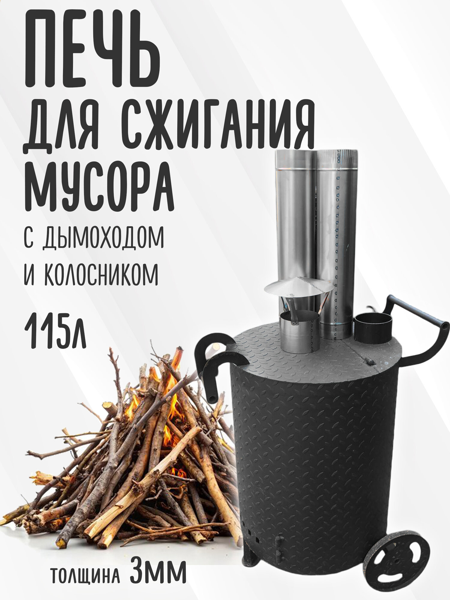 Печь для сжигания мусора с колосником и дымоходом 150л, сталь 3 мм