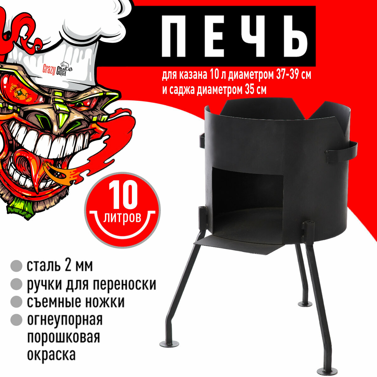 Печь для казана объемом 10 литров с ручками, съемные ножки, зольник