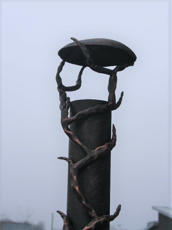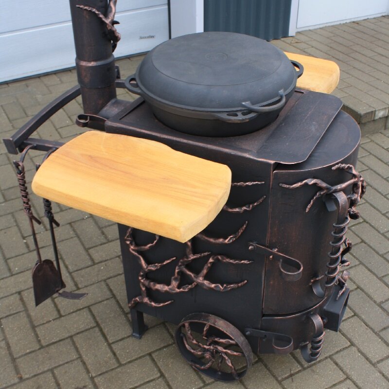 Кованная печь для казана с двумя столиками и дымоходом, на колесах, Ветки дерева - огнеупорная краска интересное: