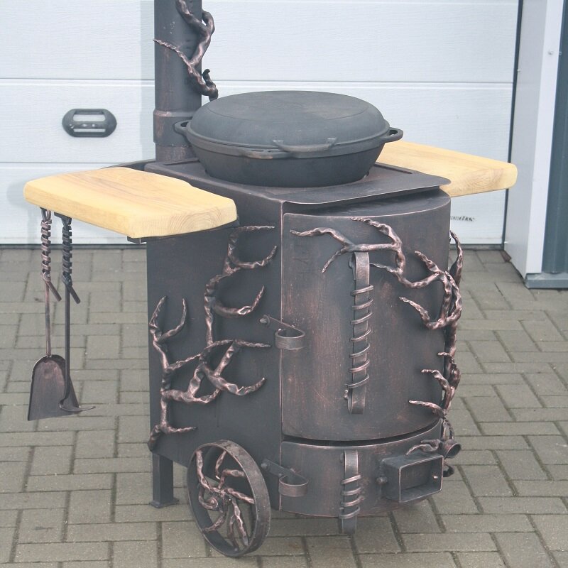 Купить Кованная печь для казана с двумя столиками и дымоходом, на колесах, Ветки дерева - огнеупорная краска