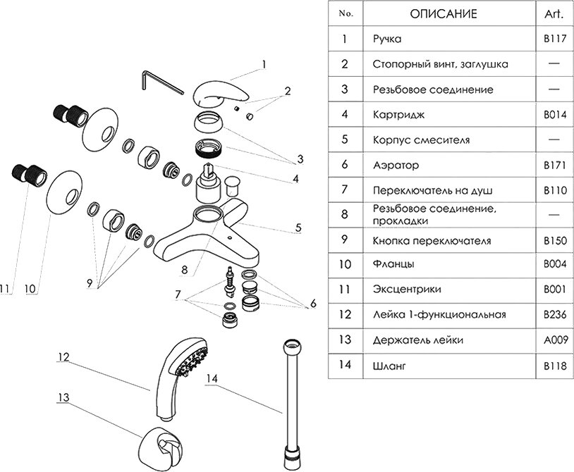 | Особенности | S-образные эксцентрики / аэратор / держатель душевой лейки |