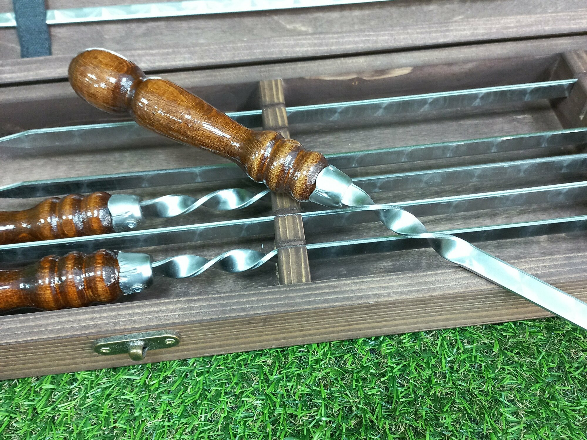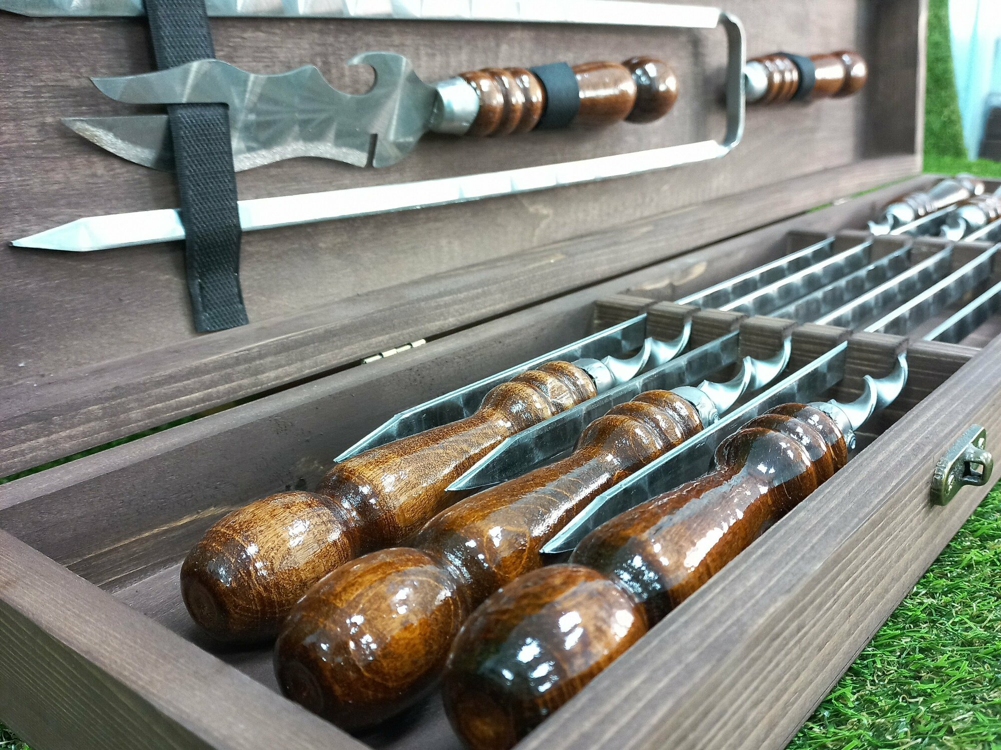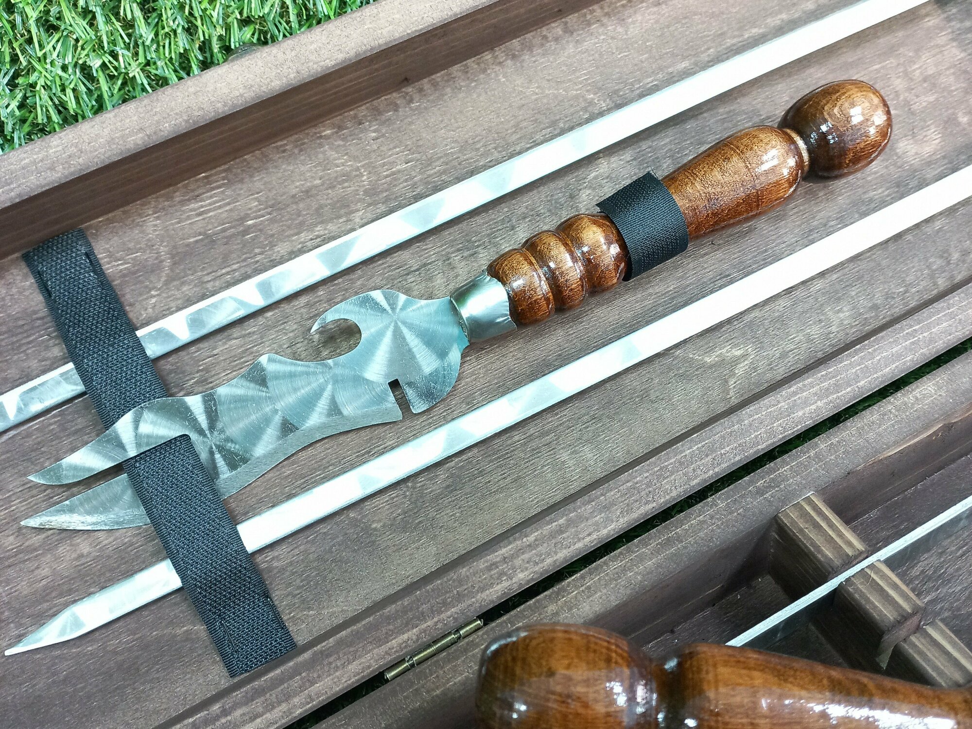 Набор шампуров в подарочном футляре (6 шампуров+двойной шампур+нож) интересное: