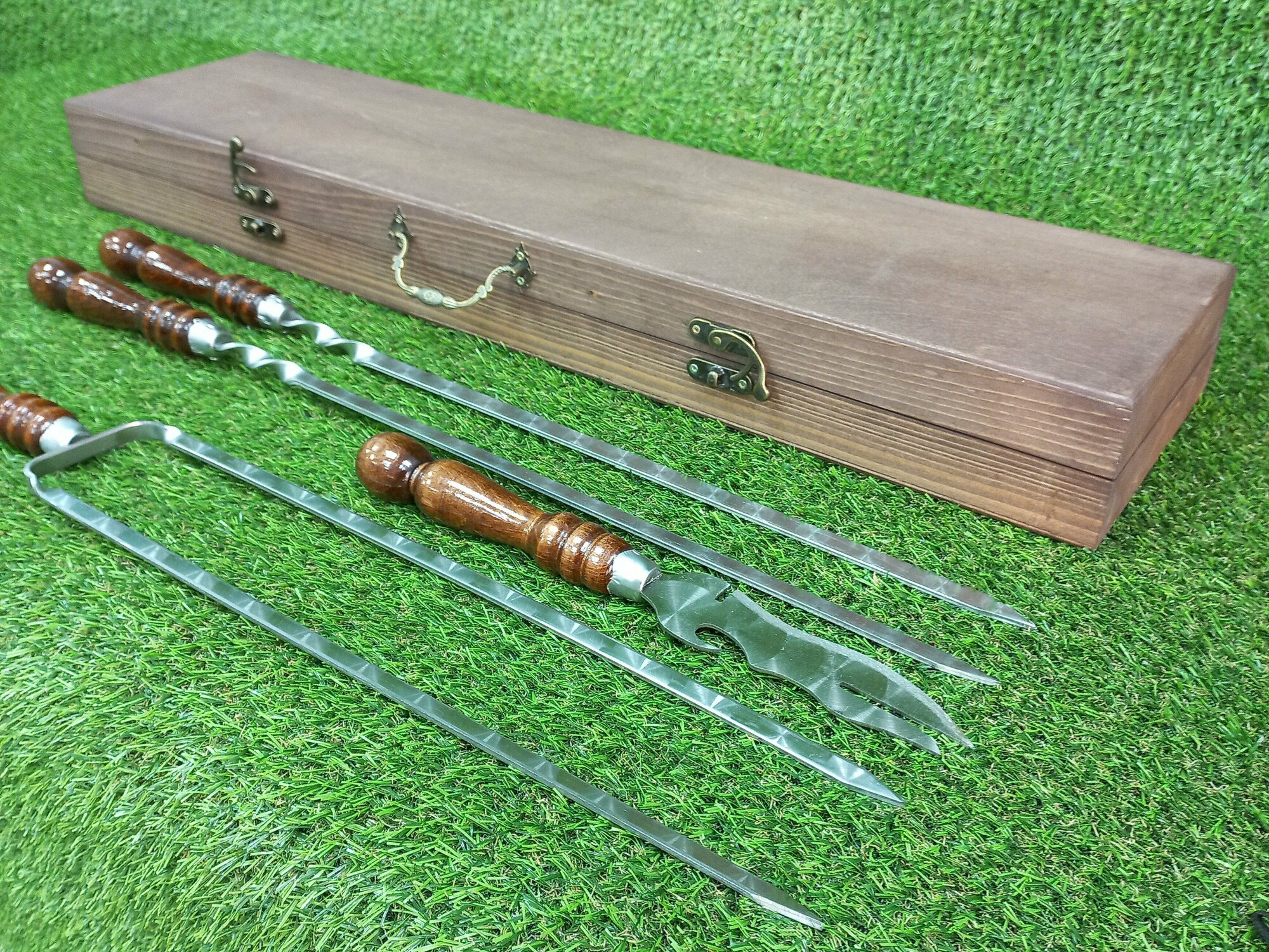 | Комплектация | 6 шампуров , нож , двойной шампур ,футляр. |