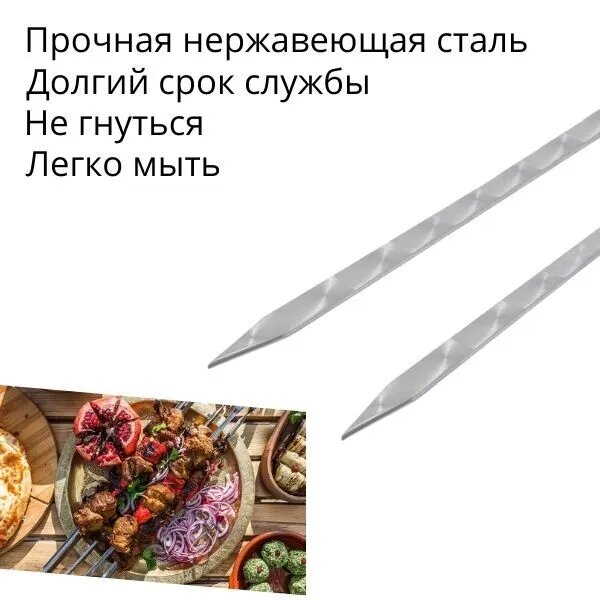 | Дополнительная информация | Шампуры не поддаются коррозии, со временем металл не темнеет. Шампура из нержавеющей стали хорошо заточены, что позволяет им справиться со всеми видами мяса и овощами. |