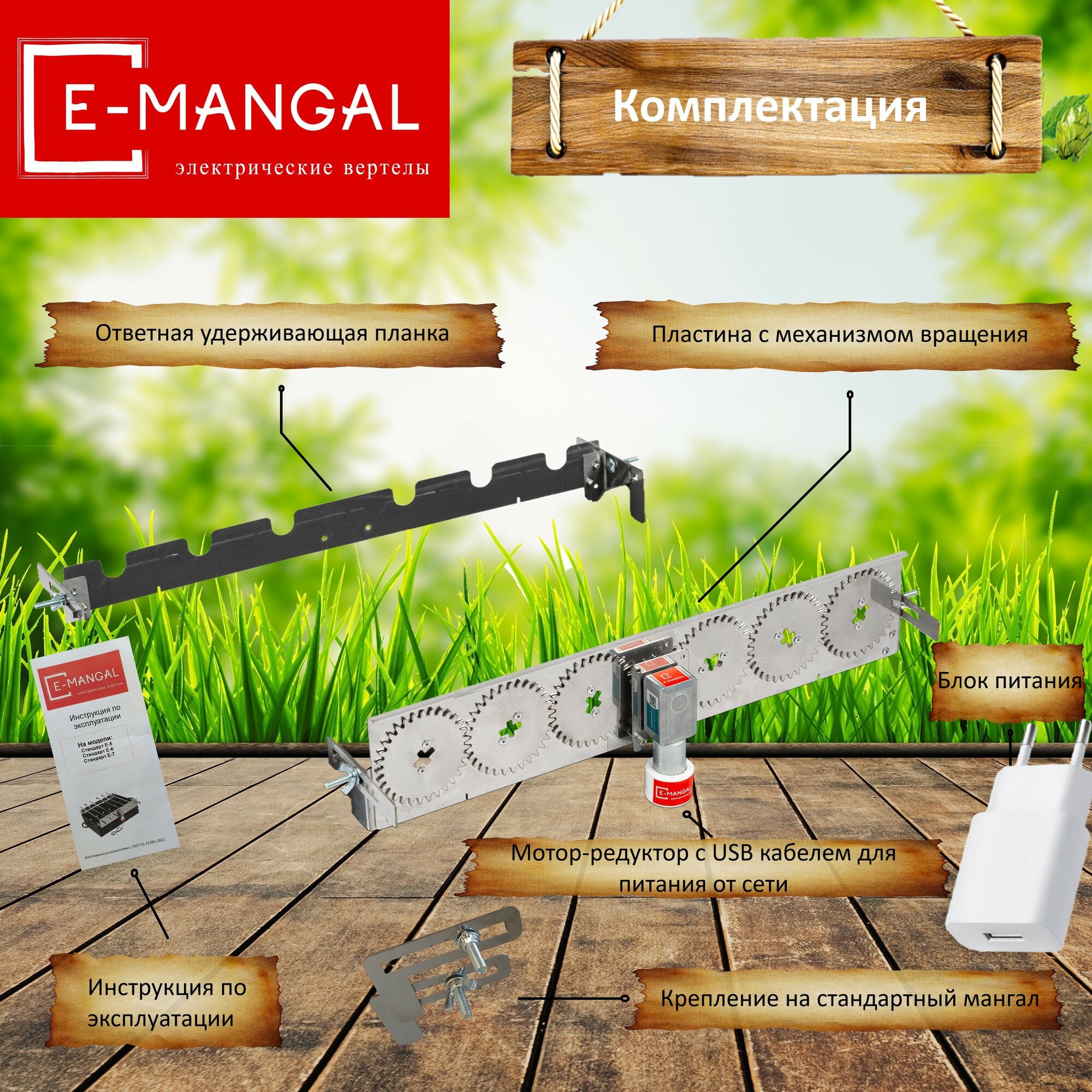 | Комплектация | Мотор-редуктор с USB кабелем для питания от сети или Power Bank – 1шт. Ответная удерживающая планка – 1 шт. Инструкция по применению – 1 шт. PowerBank для автономной работы без сети 220 вольт Крепление на мангал. (универсальное или телескопическое - полозья) – 1 комплект. |