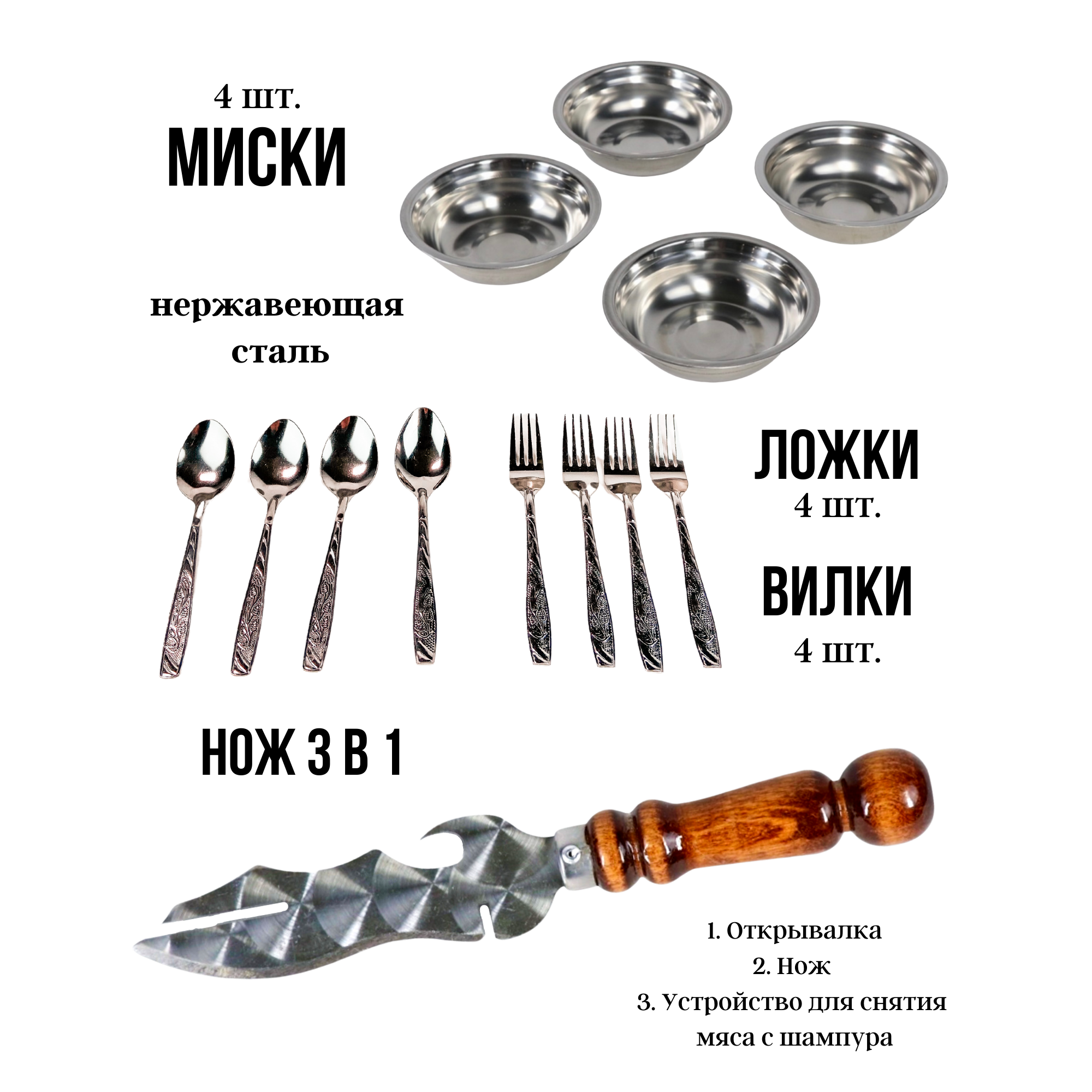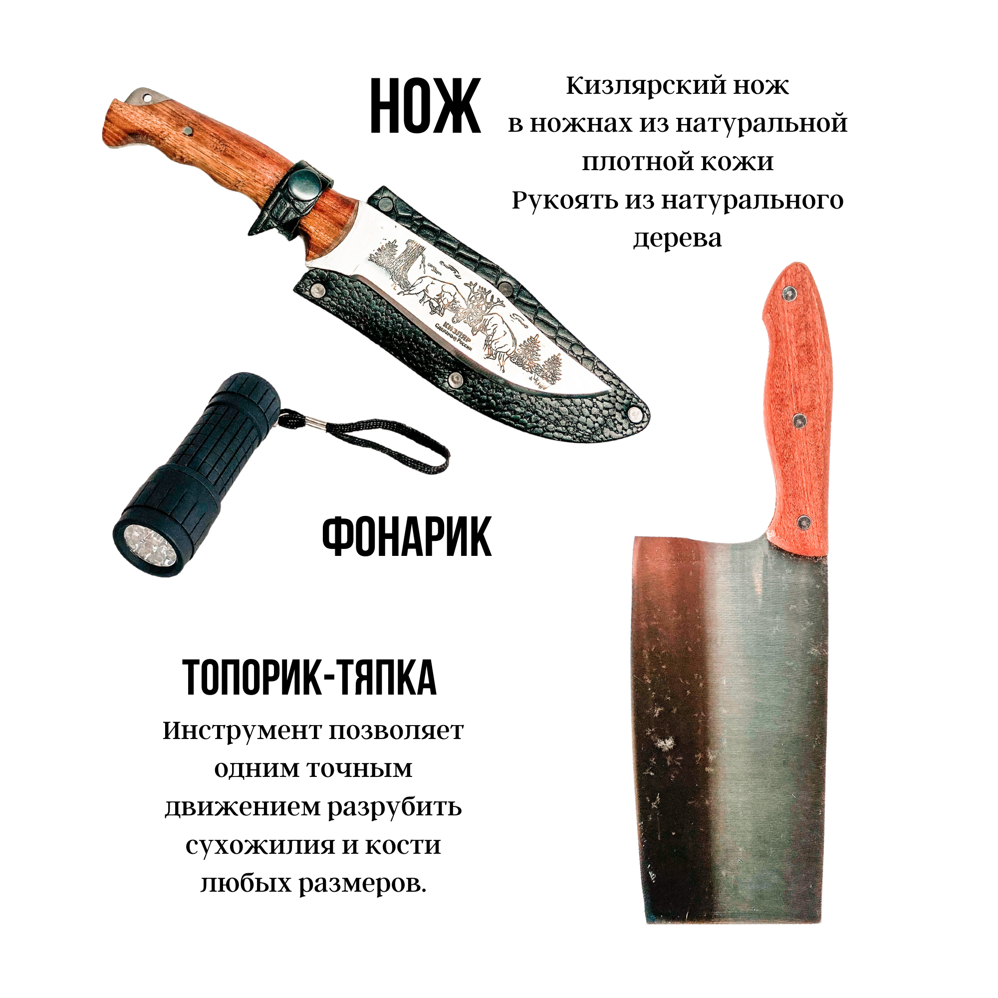| Комплектация | 6 шампуров с деревянной ручкой, мангал (таганок), нож разделочный (Кизляр), топорик кухонный, фляга из нержавейки, набор посуды на 4 персоны ( по 4 шт. каждого предмета: миски, ложки, вилки, стаканчики), поднос для шашлыка, фонарик, зажигалка в форме патрона. |