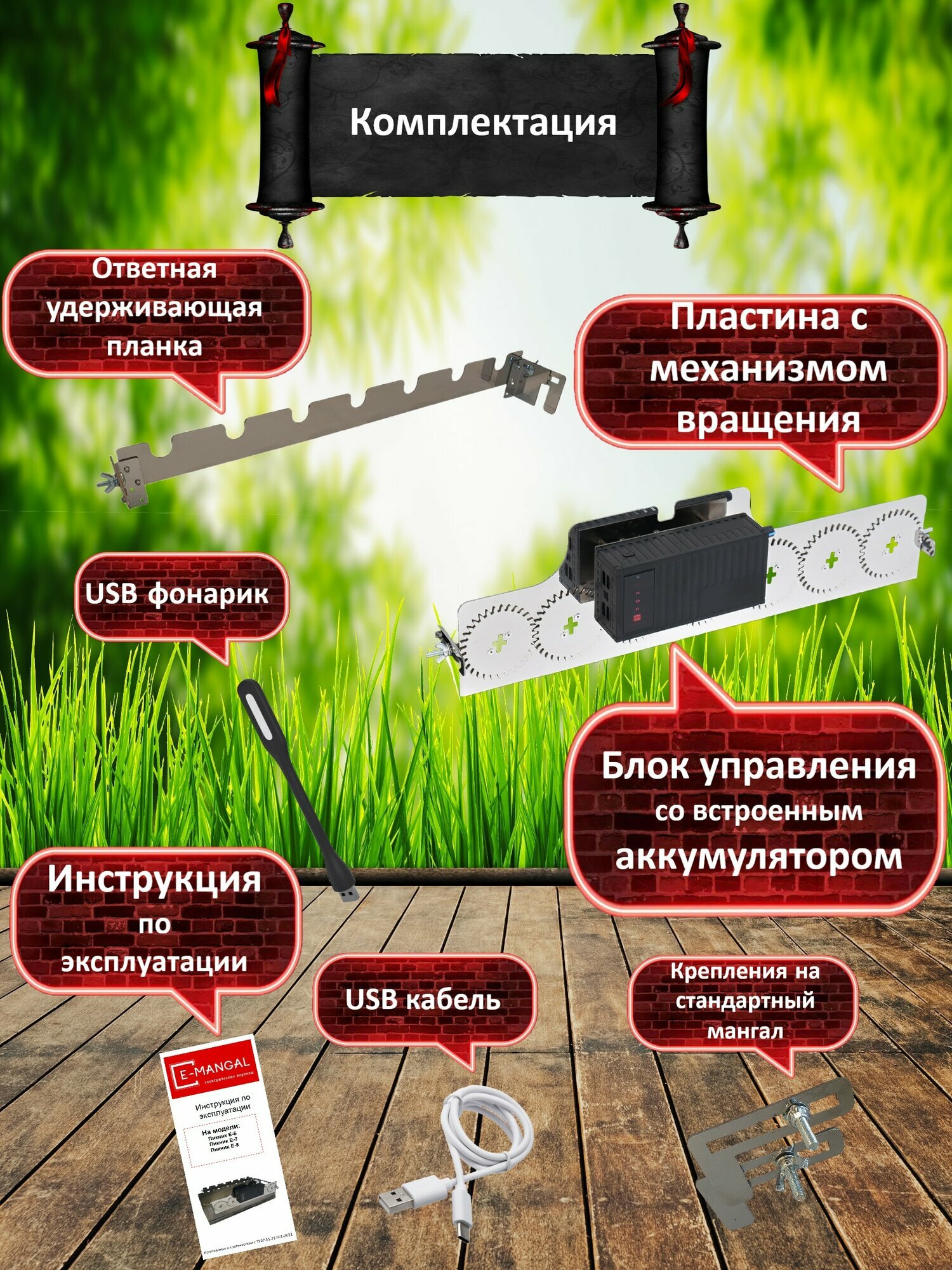 | Комплектация | Блок управления и пластина с механизмом вращения – по 1шт., Ответная удерживающая планка – 1 шт., Инструкция по применению – 1 шт., USB кабель – 1 шт., Крепление на мангал, светодиодный USB фонарик- 1шт. |