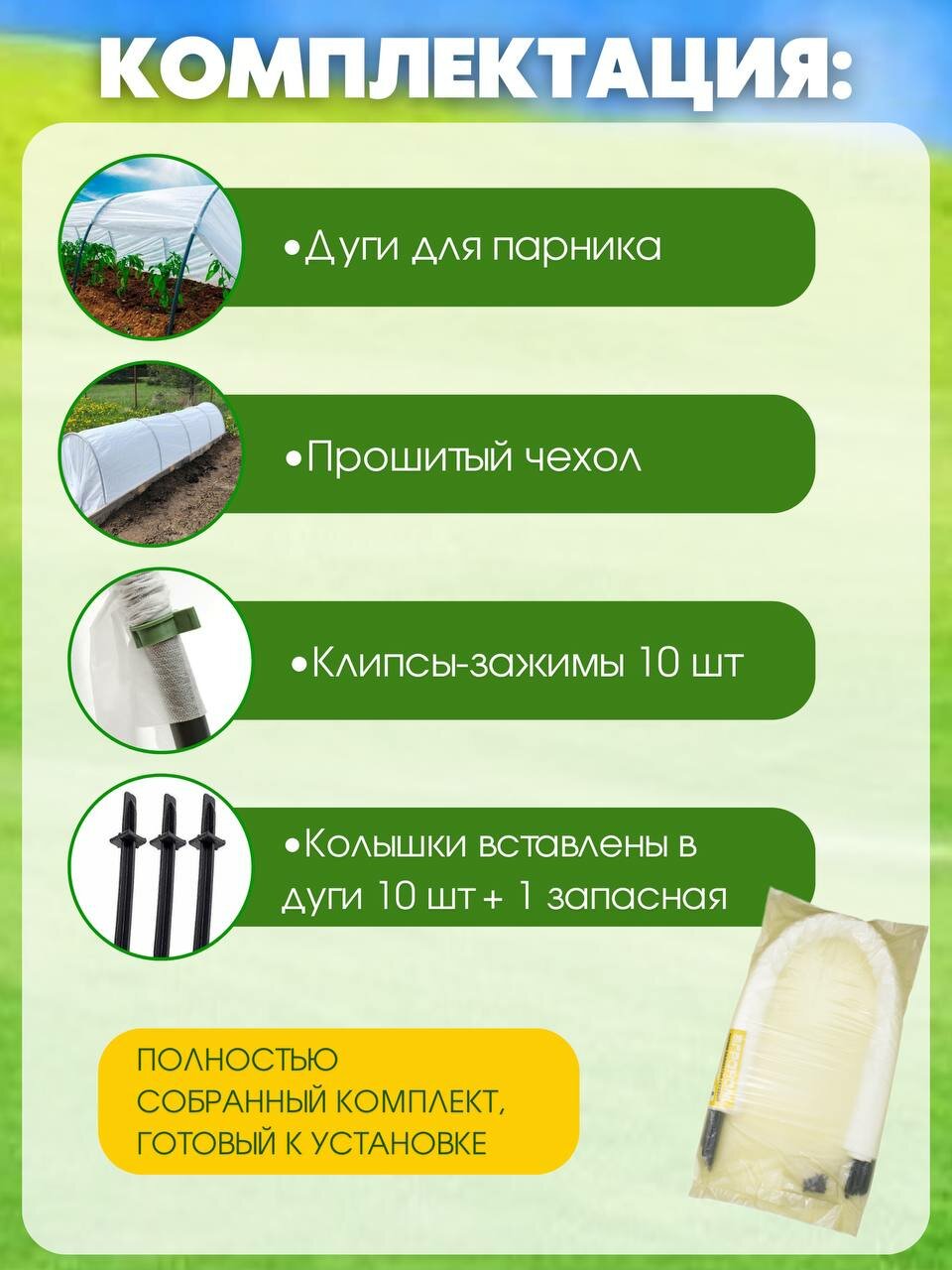 | Комплектация | каркас парника, укрывной материал, клипсы-зажимы 10шт |