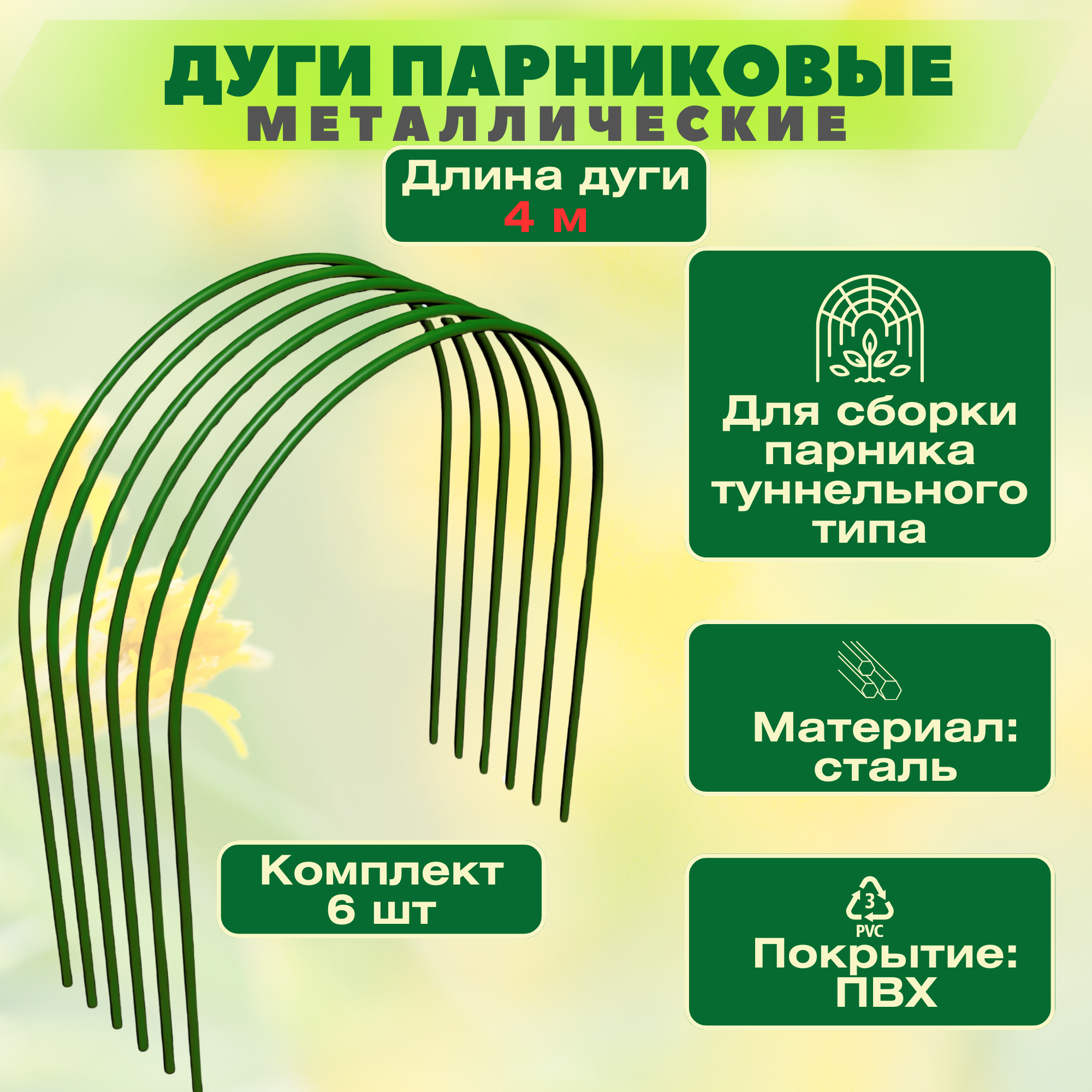 Дуги стальные парниковые в оболочке ПВХ, набор 6 шт, 10 мм x 4 м, цвет зеленый, защищены от коррозии, подходят для сборки парников и теплиц тоннельного типа с использованием различных укрывных материалов интересное: