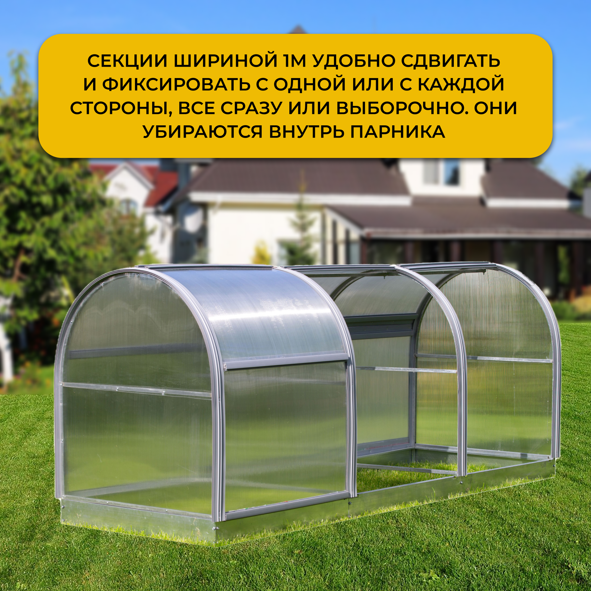 | Комплектация | Каркас, поликарбонат на торцы, поликарбонат на секции, ручки пластиковые, направляющие пластиковые, метизы, инструкция. |