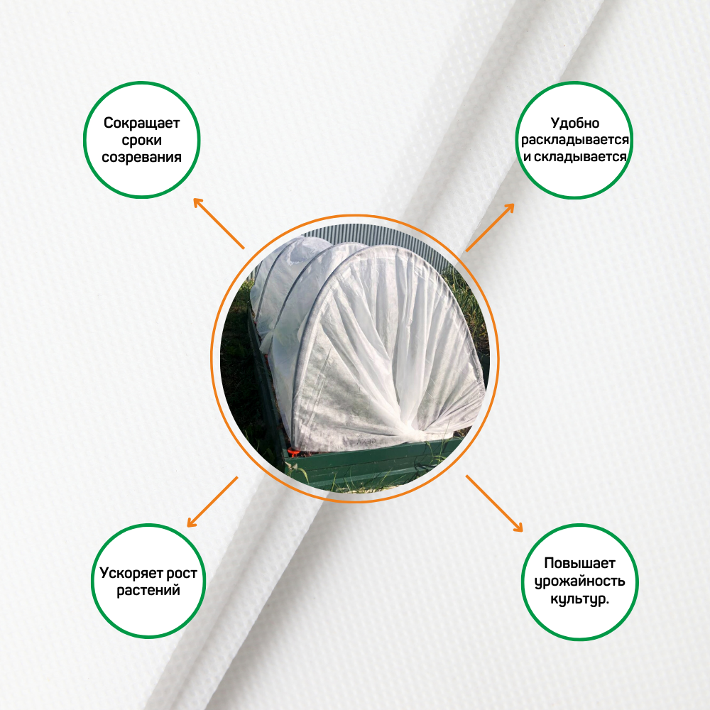 | Комплектация | Дуги, клипсы для крепления, колышки, укрывной материал спанбонд |