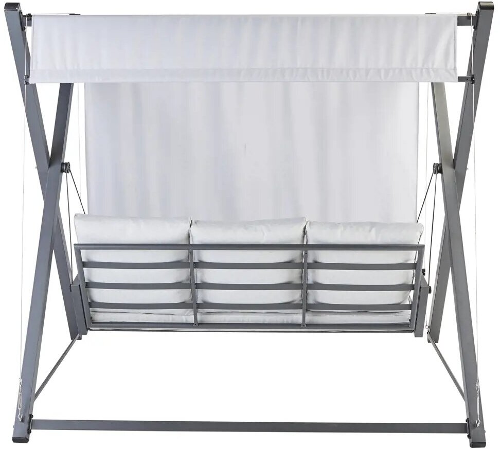 Качели садовые People 3-х местные до 395 кг белый/серый. Крыша двигается по натянутым по бокам тросам и позволяет наслаждаться солнцем интересное: