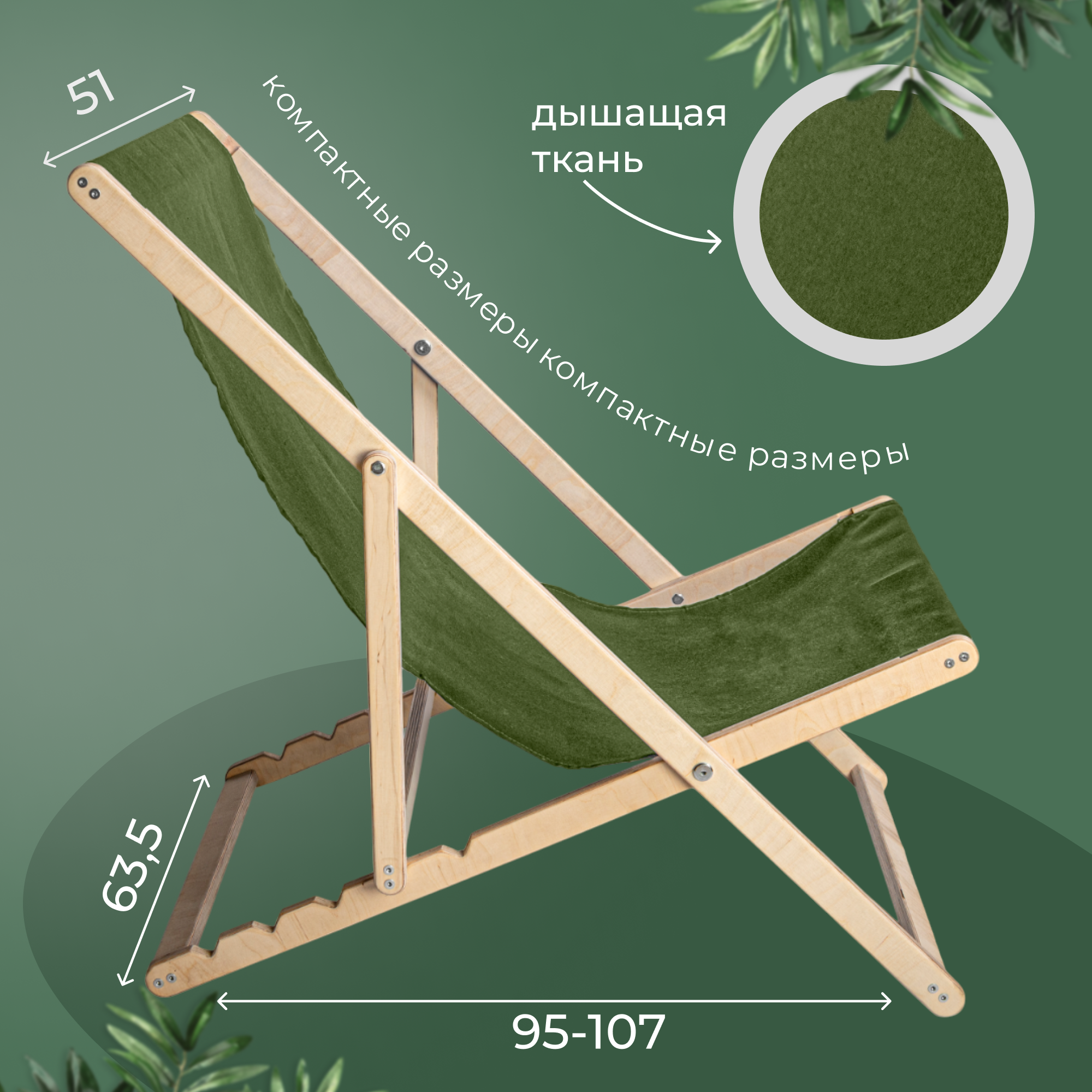 Кресло-шезлонг "Берёзка" без шлифовки с зеленой тканью складной для дома и дачи интересное: