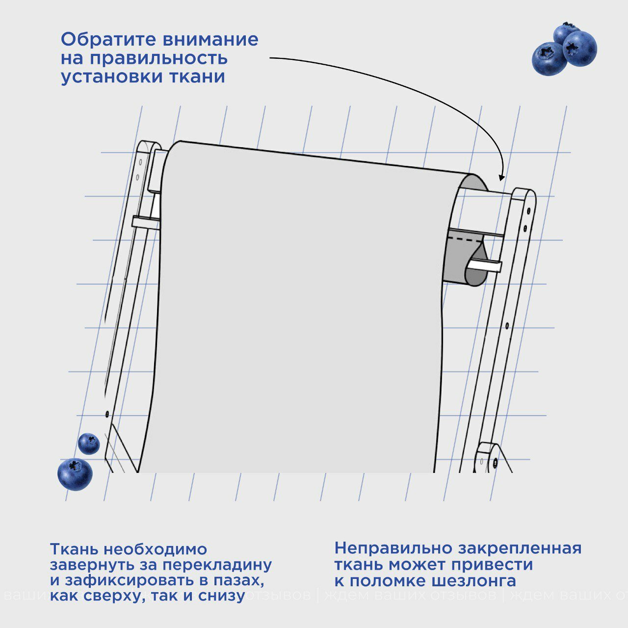 Кресло-шезлонг "Березка" без шлифовки с синей тканью складной для дома и дачи, комплект 2 шт